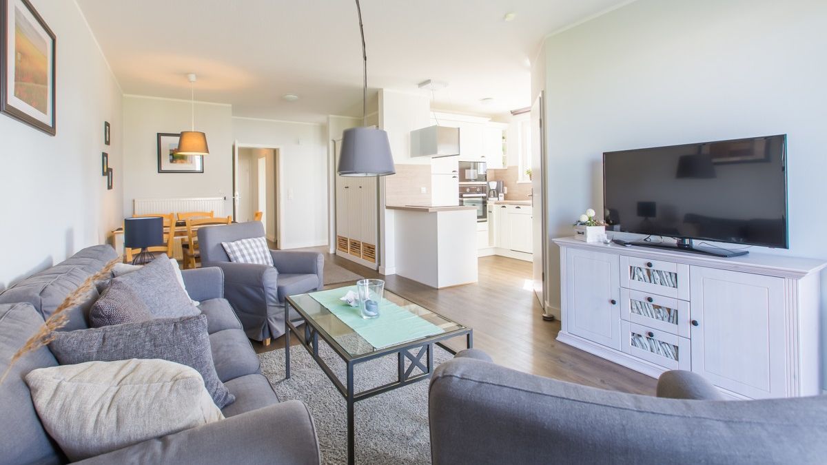 Die Wohnung ist hochwertig und ausgesprochen geschmackvoll und modern eingerichtet. In den Wohnbereich mit Couchecke, Sessel, Flatscreen-TV und Essbereich ist eine Küche integriert. Auch von hier aus erfreut Sie der einmalige Blick auf das Meer. Das Schlafzimmer verfügt über ein Doppelbett und grenzt an den Südbalkon.