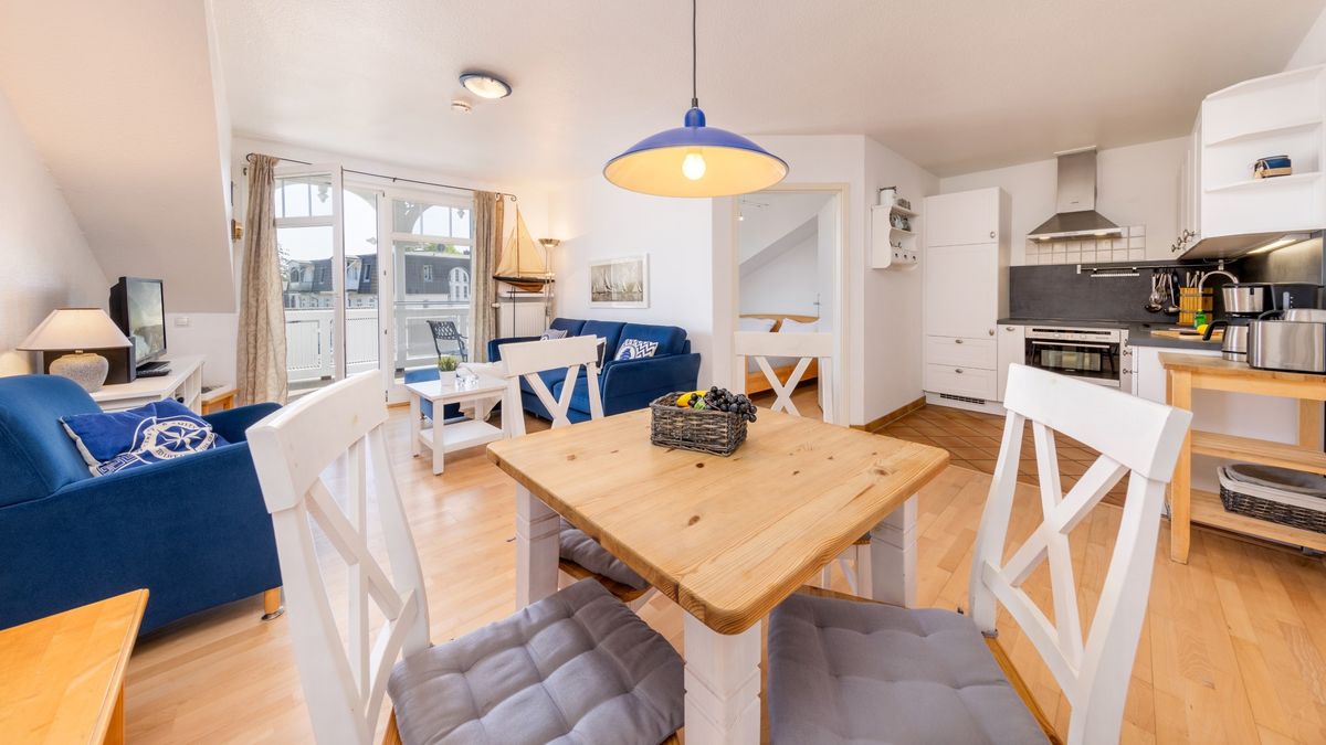 Die "Trauminsel" bietet auf 62qm Wohnfläche einen gemütlichen Wohnraum mit integrierter Küche, einen Schlafraum und ein Bad mit Dusche. Auf der 26qm großen Dachterrasse sowie einem zusätzlichen Balkon genießen Sie die frische Seeluft. Ein Strandkorb und Gartenmöbel laden hier zum Verweilen ein. Im Schlafzimmer finden Sie ein großes Doppelbett, das Bad besitzt eine ebenerdige Dusche.