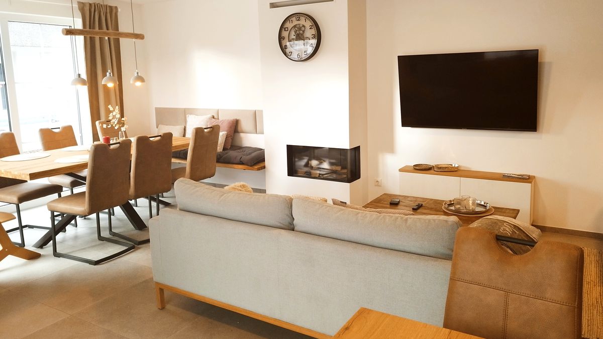 Der offene, lichtdurchflutete Wohnbereich mit integrierter, optimal ausgestatteter Küche lädt zum gemeinsamen Kochen oder Relaxen auf den Sofas oder vor dem Gaskamin ein. Am großen Esstisch, von dem man durch die bodentiefen Fenster in den Garten blickt, finden 8 Personen bequem Platz.