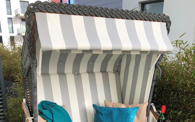 Die Wohnung verfügt über eine große Dachterrasse mit Strandkorb und einen Balkon mit Gartenmöbeln. Hier darf auch der Lotus-Grill zum Einsatz gebracht werden.