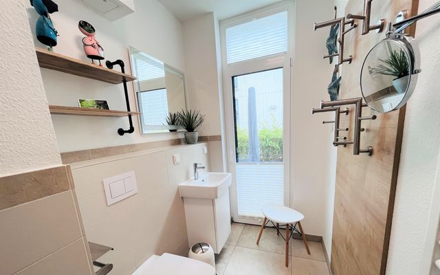 Die schöne und nigelnagelneue Ferienwohnung "Kleine Robbe" befindet sich im Bodden-Markt Glowe nur 2 min vom Strand entfernt.
