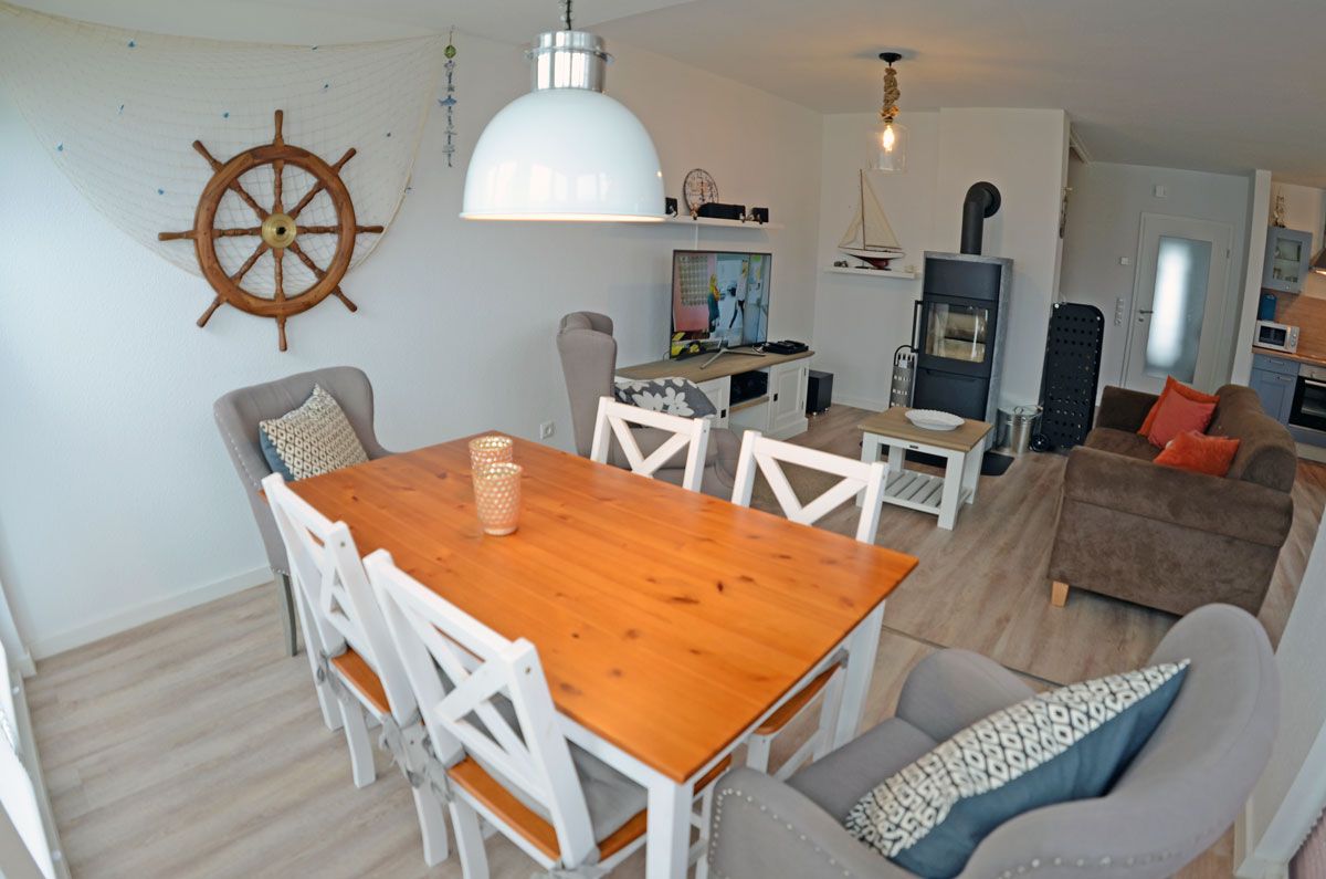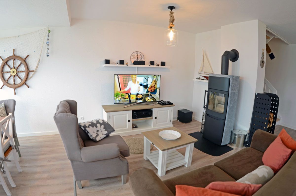 Das Ferienhaus "Bootsmann" ist im Erdgeschoss ausgestattet mit einem großzügigen Wohn- und Essbereich mit gemütlicher Couchlandschaft, Kamin und TV, Sat mit Dolby Surround Anlage, DVD & CD Player, Gesellschaftsspielen und Büchern, mit einer offenen, komplett ausgestatteten Einbauküche mit 4- Plattenherd (Ceranfeld), Backofen, Kühl- und Gefrierkombination, Geschirrspüler und diversen Elektrogeräten z.B. Mikrowelle, Kaffeemaschine. Hier steht auch ein Bad mit Dusche zur Verfügung. Das Schlafzimmer im EG ist mit einem Etagenbett (Matratze je 90×200), Kinderspielzeug und großem Kleiderschrank eingerichtet. Im Abstellraum steht eine Waschmaschine zur Verfügung.