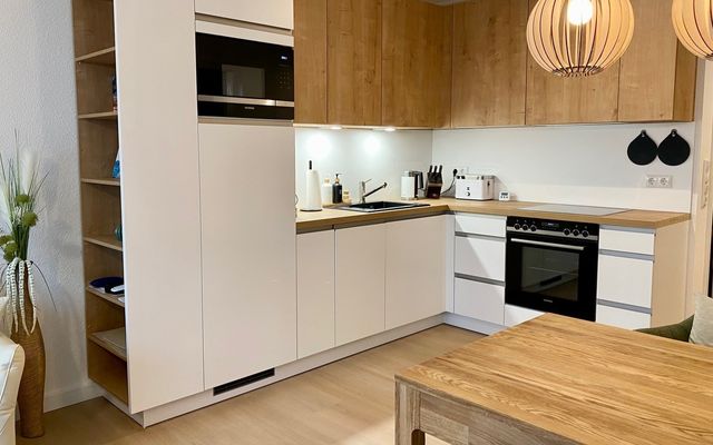 Die Wohnung ist hoch- und neuwertig eingerichtet und vorallem nachhaltig eingerichtet. Das Schlafzimmer mit Echtholzmöbeln beherbergt ein großes Doppelbett, einen begehbaren Kleiderschrank und eine Infrarotkabine. In den großzügigen Wohnbereich ist eine moderne, vollausgestattete Küche integriert, außerdem finden Sie einen Essbereich sowie eine behagliche Couchecke mit großem TV-Gerät.