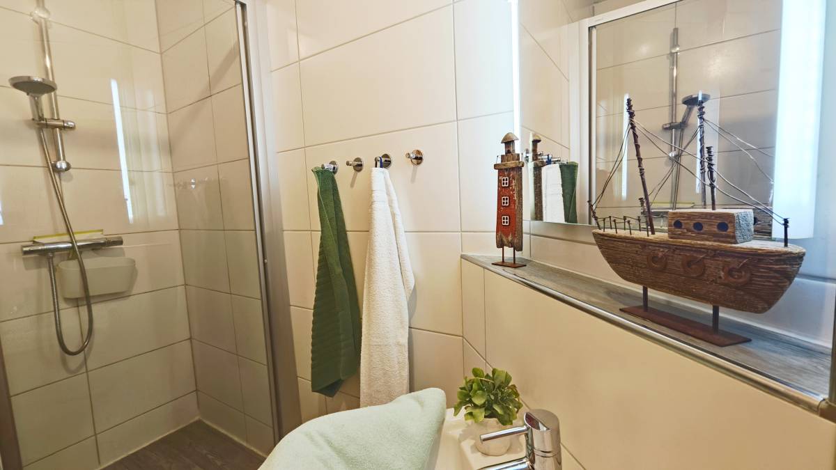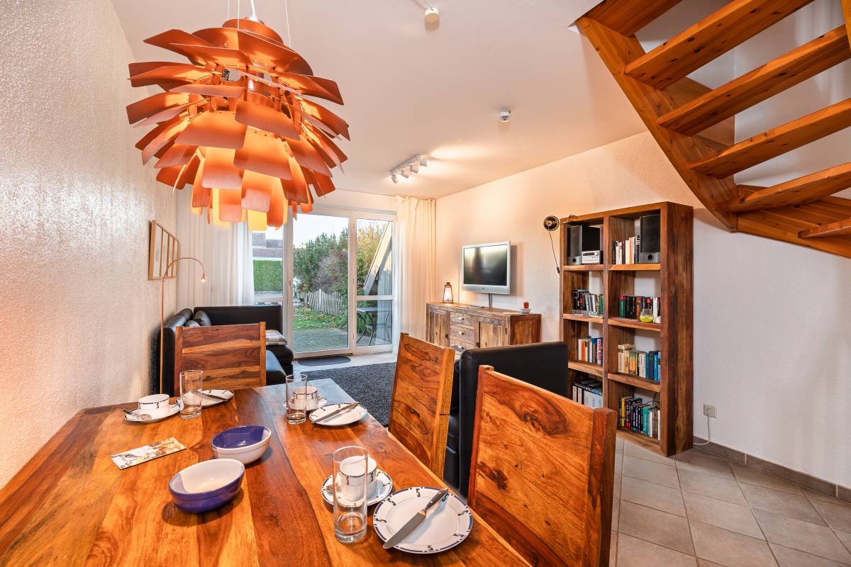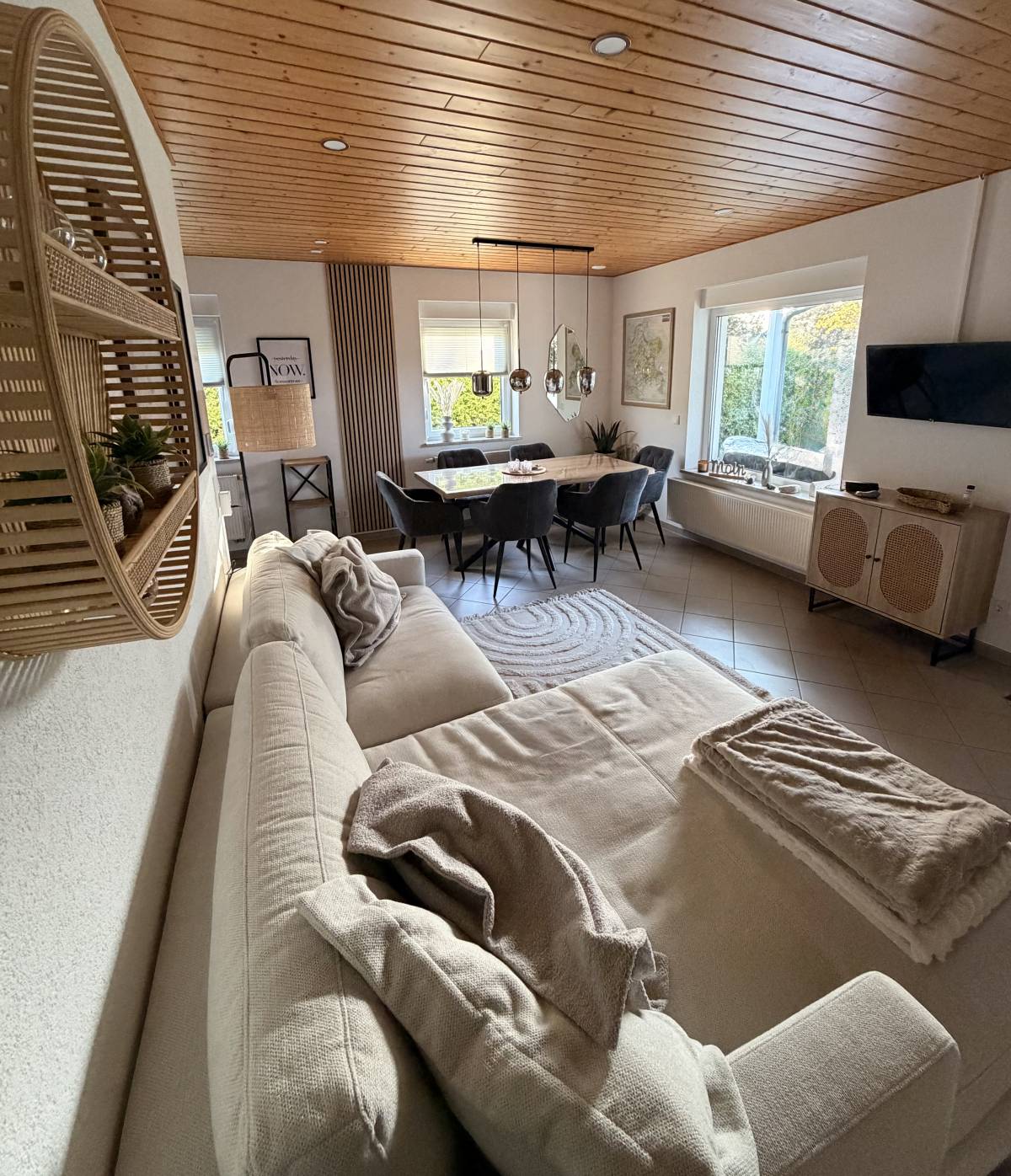 Der ZweiundMeer Bungalow 1 bietet Platz für bis zu fünf Personen und verfügt über drei gemütliche Schlafzimmer. Ein Schlafzimmer ist mit einem Doppelbett ausgestattet, ein weiteres mit einem Etagenbett und das dritte mit einem Einzelbett. Der helle Wohn- und Essbereich bildet den zentralen Treffpunkt des Hauses und lädt zu gemeinsamen Stunden ein. Die neuwertige, voll ausgestattete Küche ermöglicht eine komfortable Selbstversorgung. Das moderne Badezimmer überzeugt mit einer großzügigen Dusche sowie einem praktischen Waschtrockner.