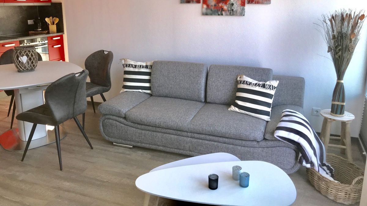 Die Wohnung bietet auf 50qm Wohnfläche einen gemütlichen Wohnraum mit integrierter Küche, einen Schlafraum mit Doppelbett und ein Bad mit bodengleicher Dusche. Sie bietet Platz für bis zu 4 Personen (2 Erw. + 2 Kinder). Auf dem Balkon mit West-Ausrichtung lassen Sie die Seele baumeln. An kalten Tagen können Sie gemütliche Stunden vor dem Kamin verbringen. Zur Wohnung gehört außerdem ein Parkplatz. Im Haus steht eine Gemeinschaftssauna mit Relaxbereich zur Verfügung, welche Sie nach Anmeldung kostenfrei nutzen.