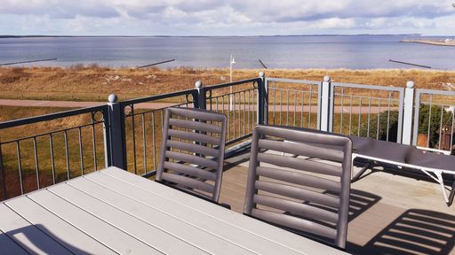 Auf der Terrasse relaxen Sie im Strandkorb oder auf den hochwertigen Gartenmöbeln und genießen den Ausblick. Der Balkon ist ebenfalls mit Gartenmöbeln ausgestattet. Ein Parkplatz befindet sich direkt vor der Unterkunft.