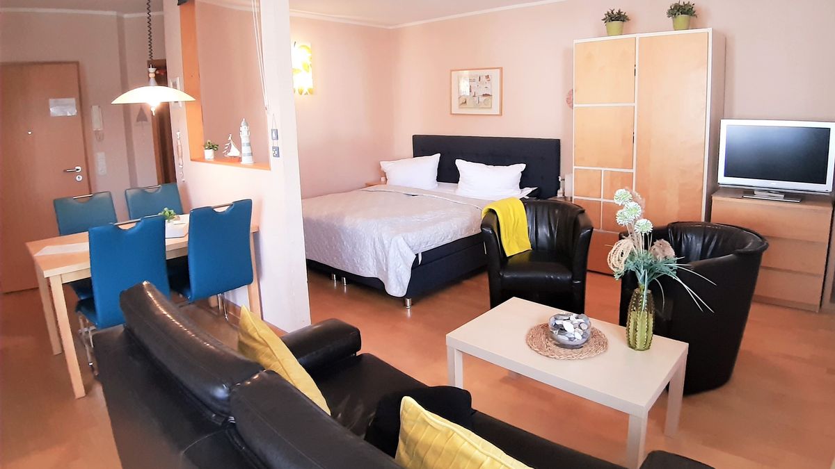 Der Wohnbereich verfügt über eine Küchenzeile, eine Sitzecke mit Couch und TV sowie etwas abgetrennt, ein bequemes Boxspringbett (180 cmx 200cm) . Der Balkon ist aus dem Wohnbereich begehbar.