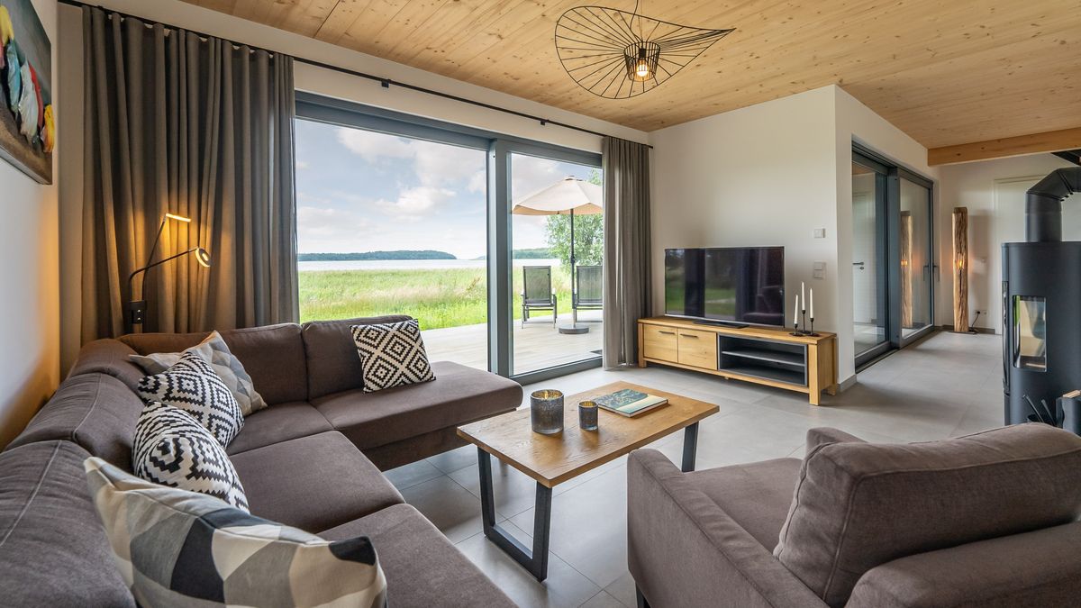 Das Herzstück des Hauses ist der große Wohnraum mit topp moderner Küche mit Kochinsel, großzügigem Essbereich, Kamin und etwas separat einer gemütlicher Couchecke mit TV. Außerdem befinden sich im Erdgeschoss ein Schlafzimmer, ausgestattet mit Doppelbett, TV und angeschlossenem Bad und ein Gäste-WC mit Waschmaschine und Trockner. Zwei weitere großzügige Schlafzimmer mit jeweils zwei Doppelbetten und TV befinden sich im ersten Obergeschoss. An diese grenzt ein Bad mit Walk-in-Dusche und Fenster. Die Galerie mit Ihrer Loggia eröffnet einen phantastischen, weiten Blick über die wunderbare Natur des angrenzenden Boddens bis nach Lietzow. Nachts ist sogar das Leuchtfeuer von Kap Arkona zu erkennen. Weiterhin steht hier ein Wellnessbad mit Sauna inkl. zusätzlichen Infrarotstrahlern zur Verfügung. Im Spitzboden sind zwei Einzelbetten und in einem weiteren Raum ein Arbeitsplatz (WLAN mit Glasfaseranschluss vorhanden) mit Aussicht auf den Bodden zu finden. Das Ferienhaus am See bietet Platz mit vollwertigen Betten für bis zu 8 Personen (weitere Aufbettung mit zwei Babybetten möglich).