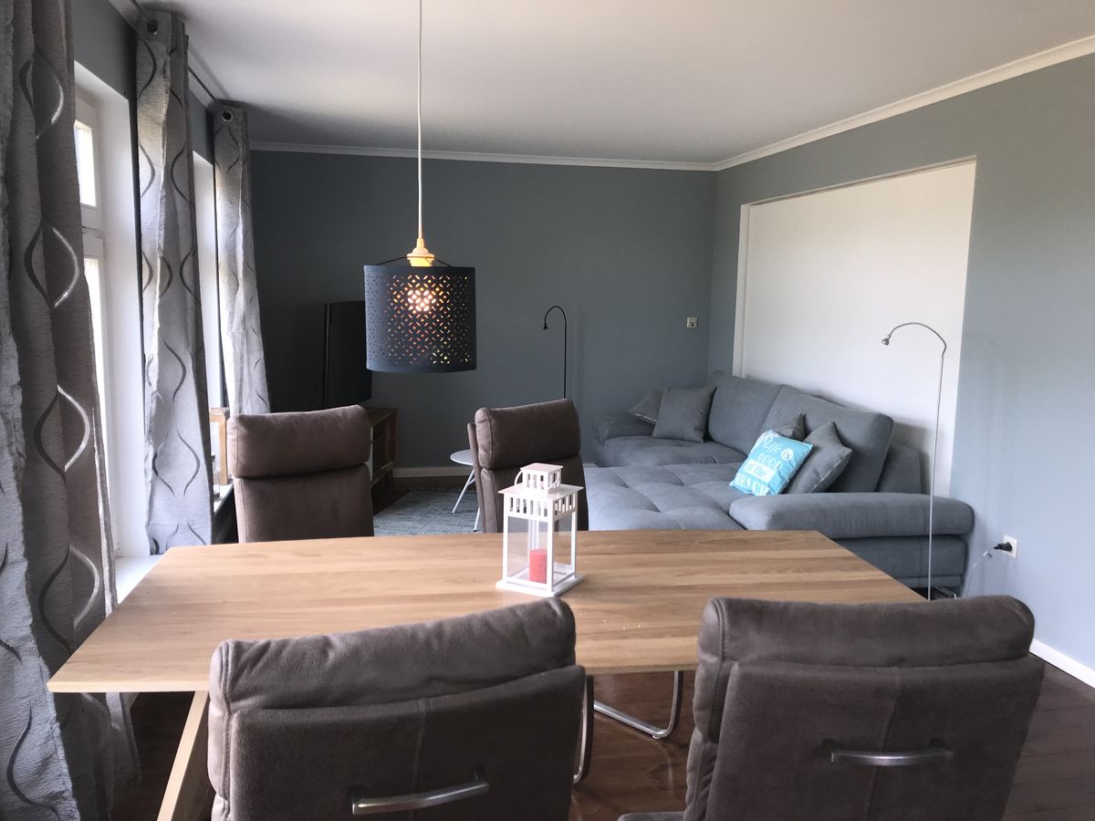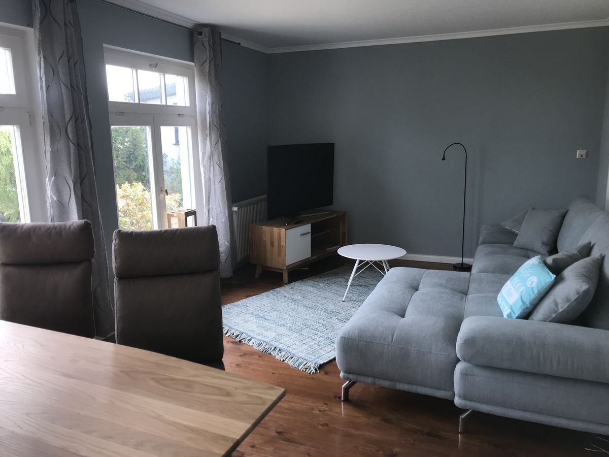 Vom Wohnzimmer mit Essbereich und großer Couch schauen Sie geradewegs in den idyllischen Garten. Der Garten bietet separate Sitzgelegenheiten und einen Gemeinschaftsgrill für die Gäste der Ferienwohnungen "Lilly" (im Erdgeschoss) und "Fritzi" (im Obergeschoss). Auf dem Grundstück steht ein Parkplatz zur Verfügung.