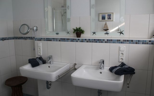 Das Schlafzimmer zur Boddenseite ist eingerichtet mit einem Doppelbett (Bettenmaß 180 x 200 cm). Von diesem Schlafzimmer aus haben Sie auch den Zugang zu einem Highlight des Hauses … dem Balkon! Ihr Logenplatz für die Naturbühne Breeger Bodden. Im zweiten Schlafzimmer befinden sich zwei Einzelbetten (Bettenmaß 90 x 200 cm). Dieses Schlafzimmer ist zusätzlich ausgestattet mit zwei Rattansesseln und einem LCD Fernseher mit DVD Player. Im großzügigen Bad im Obergeschoss befindet sich eine große Dusche, zwei Waschbecken und ein WC.