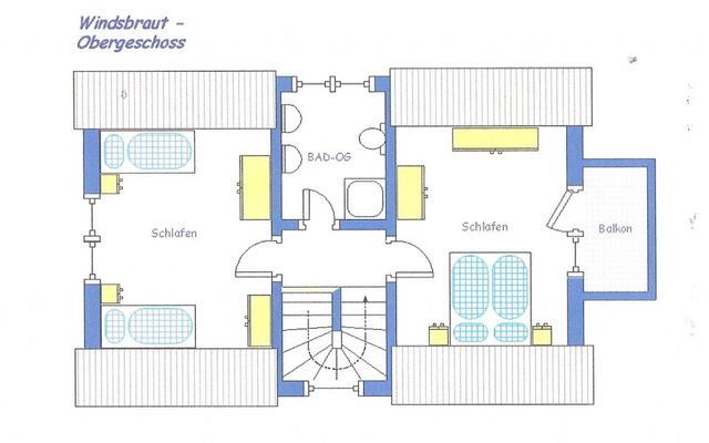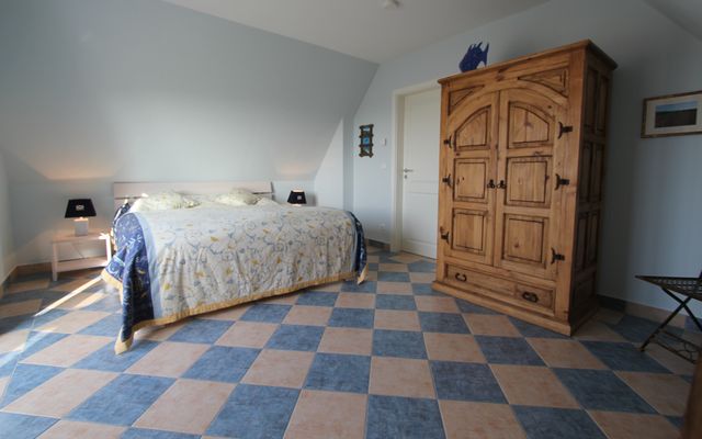 Im Obergeschoss des Hauses befinden sich zwei Schlafzimmer für insgesamt vier Personen. Diese sind liebevoll und charmant eingerichtet. In jedem der Schlafzimmer befinden sich zwei Stühle zur Kleiderablage sowie ausreichend Schrankraum, so dass Sie auch im Urlaub reichlich Platz für Ihre Garderobe haben.