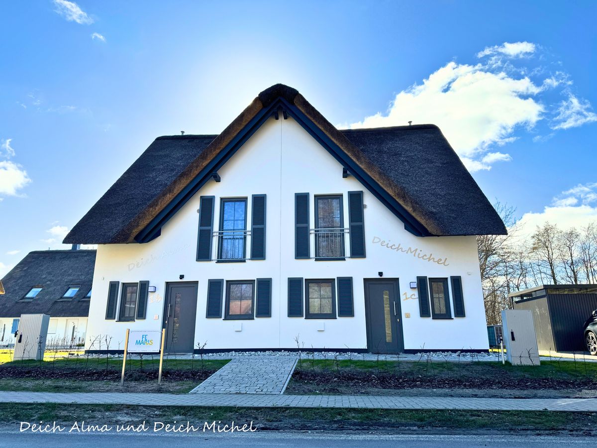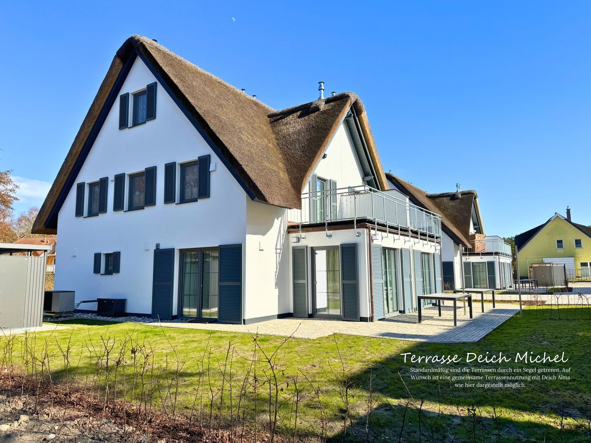 Für große oder befreundete Familien stehen die baugleichen Nachbarhäuser „Deich Frans", "Deich Frida und "Deich Alma" ebenfalls zur Verfügung. Es besteht die Möglichkeit, die Terrassentrennwände zu demontieren und so benachbarte Terrassen gemeinsam zu nutzen.