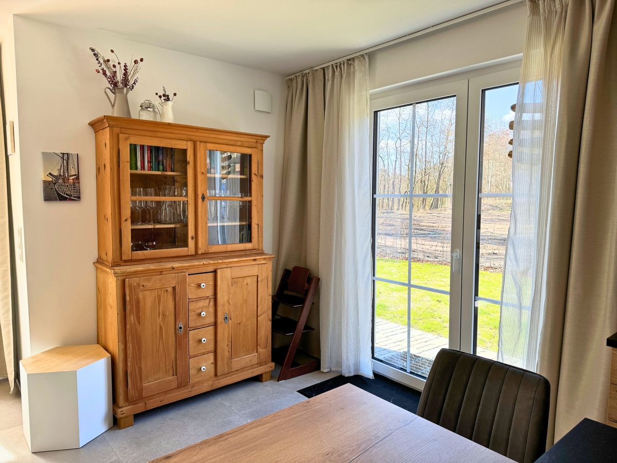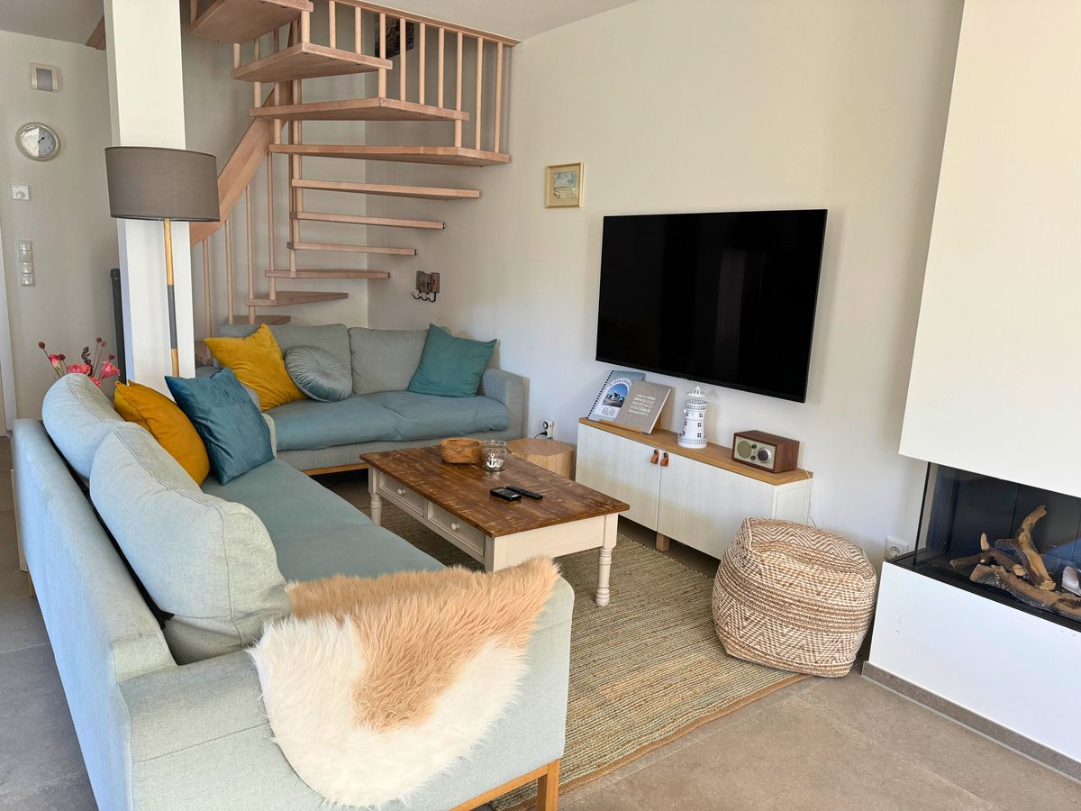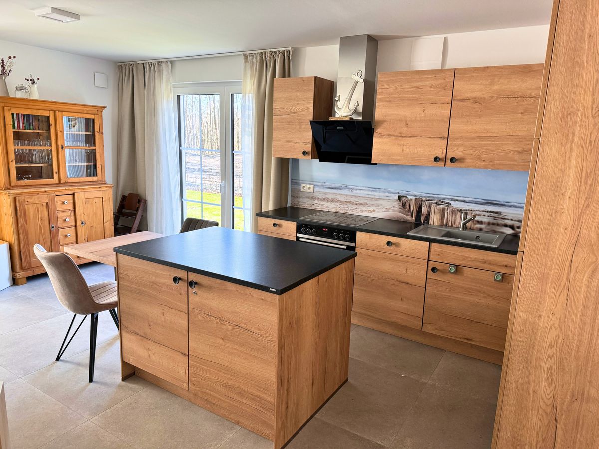 Der offene, lichtdurchflutete Wohnbereich mit integrierter, optimal ausgestatteter Küche lädt zum gemeinsamen Kochen oder Relaxen auf den Sofas oder vor dem Gaskamin ein. Am großen Esstisch, von dem man durch die bodentiefen Fenster in den Garten blickt, finden 8 Personen bequem Platz.