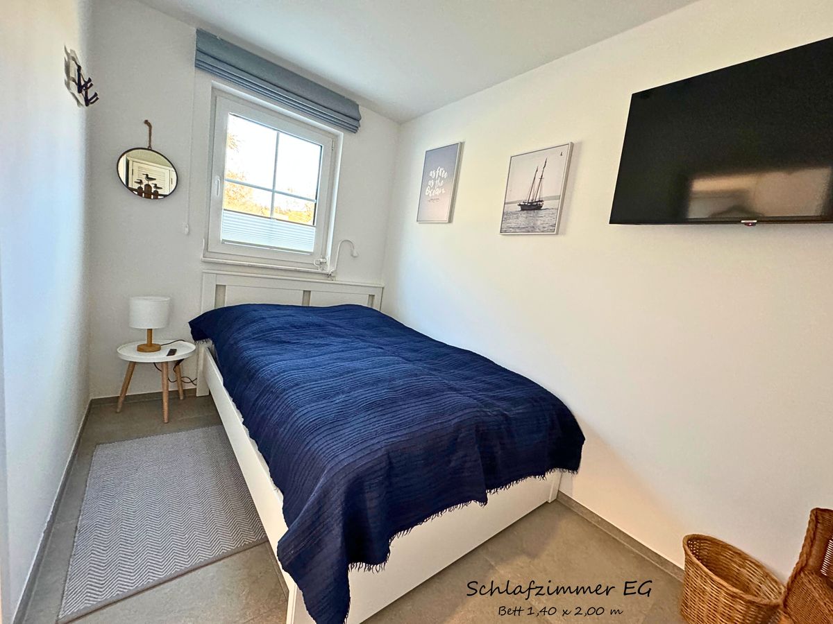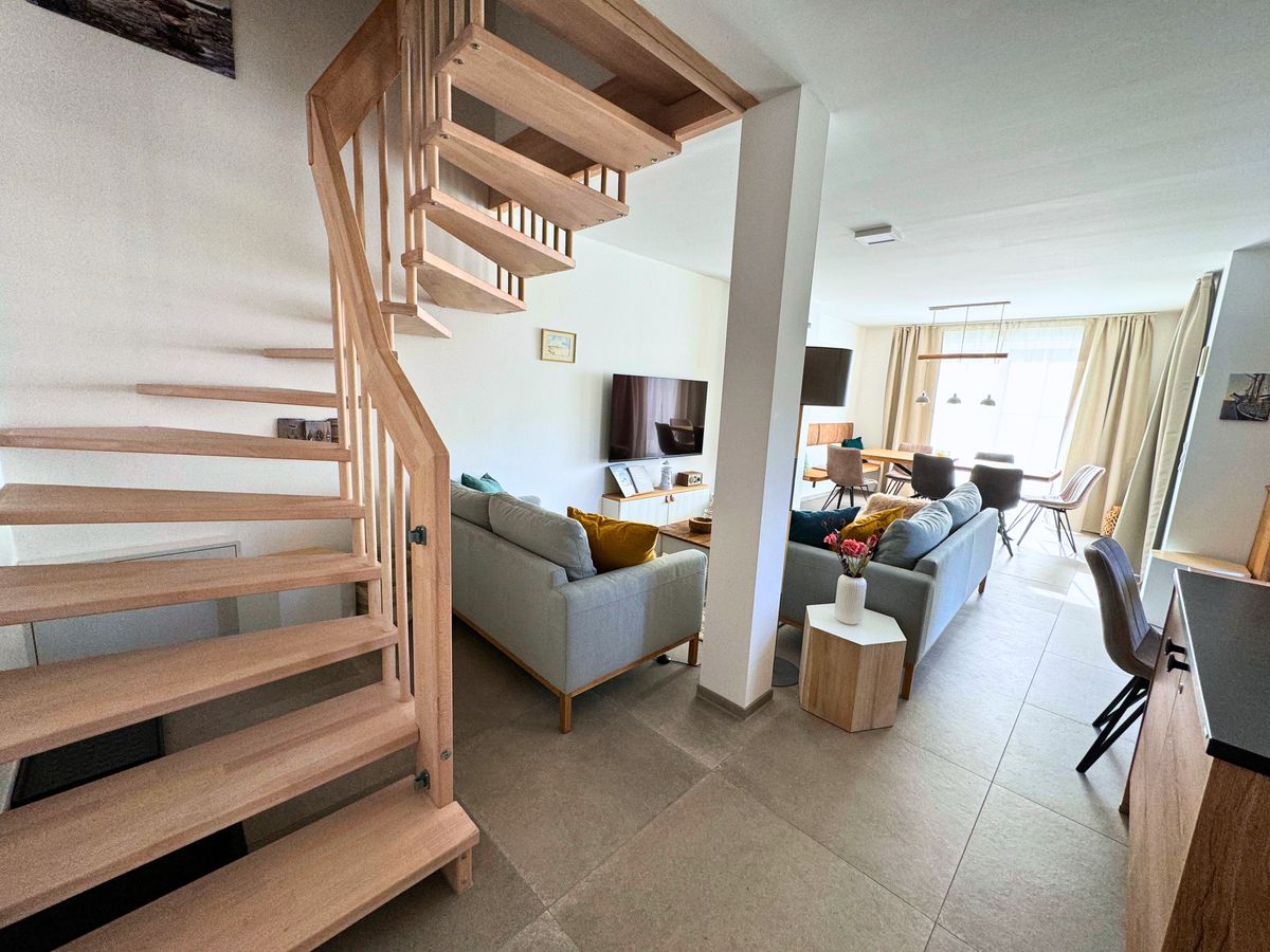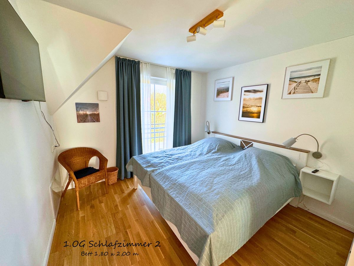 In 4 Schlafzimmern finden bis zu 8 Personen ein Plätzchen. 3 Bäder auf 3 Etagen garantieren, dass sowohl mehrere Paare, als auch große Familien mit mehreren Generation den gemeinsamen Urlaub und Privatsphäre genießen können. Im barrierefreien EG befindet sich ein Schlafzimmer mit einem 140cm x 200cm großem Bett und angrenzendem Bad mit Dusche. Im 1. OG haben 2 Schlafzimmer mit jeweils einem Doppelbett (180 cm x 200 cm) Zugang zu einem großzügigen Wellnessbad mit Sauna und Dusche. Eines der Schlafzimmer hat einen direkten Zugang zu einer großzügigen Dachterrasse, von der man auf den Leuchtturm, den Bodden und ins angrenzende Grün blickt - ideal für eine kurze Auszeit oder die Ruhephase zwischen den Saunagängen. Ein Schreibtisch sowie gemütliche Sitzmöglichkeiten im 1. OG bieten die Möglichkeit, sich zurückzuziehen - zum Arbeiten oder für eine Auszeit.
