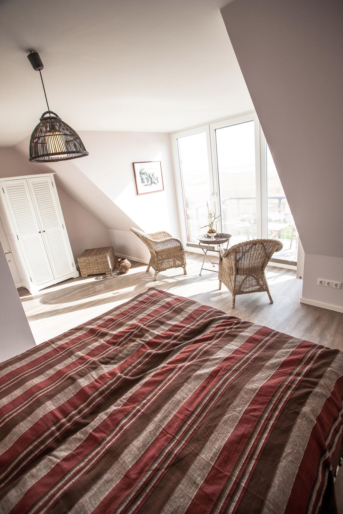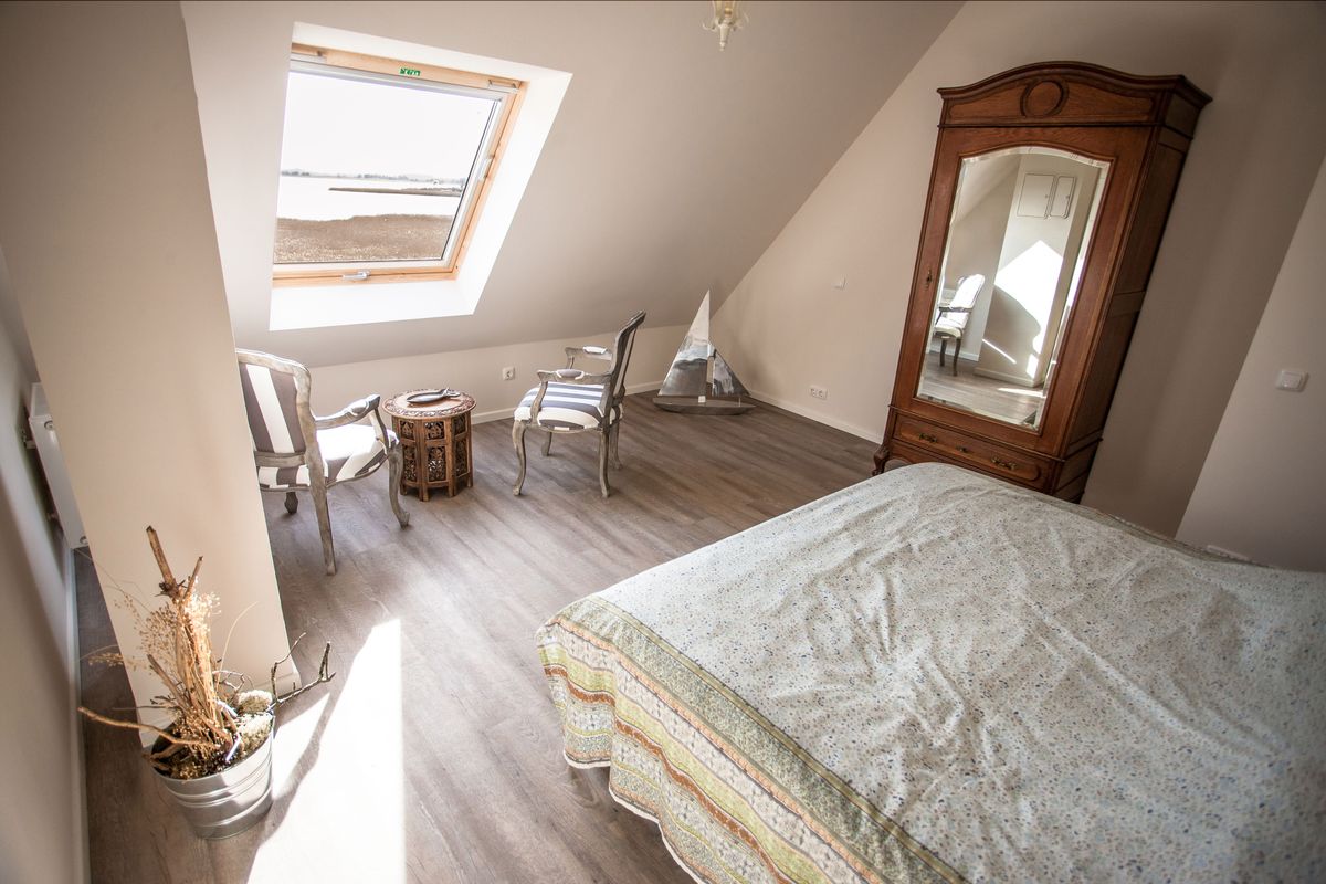 Das Obergeschoss verfügt über ein Schlafzimmer mit Doppelbett und ein Kinderschlafzimmer mit zwei Einzelbetten. Hinzu kommt im Dachgeschoss ein weiteres Schlafzimmer mit Doppelbett. Ein Kinder-/ Babybett kann zugestellt werden.