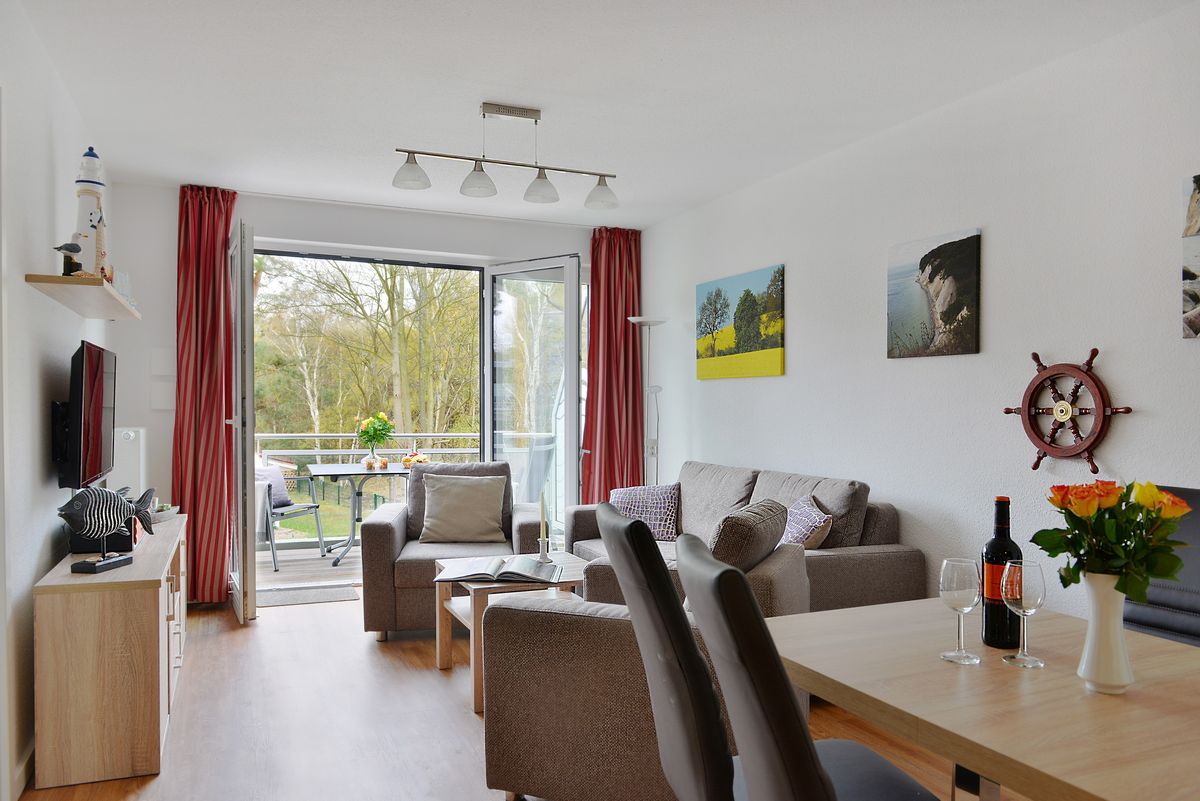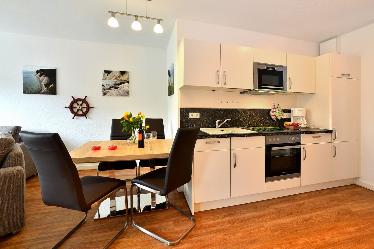 Die komfortabel eingerichtete und liebevoll dekorierte "Suite Meeresblick" befindet sich im Strandhaus Juliusruh, direkt hinter der Düne des Seebades Juliusruh. Hier können Sie die Nähe zum Meer mit entspannten Stunden auf dem Balkon oder Spaziergängen am Strand genießen. Die Ferienwohnung besitzt ein Schlafzimmer mit Doppelbett und eine Schlafcouch im Wohnbereich. In den Wohnbereich mit angrenzendem Balkon ist eine vollwertige Küche mit Esstisch integriert. Im Strandhaus Juliusruh stehen Ihnen eine Waschmaschine und Trockner sowie eine Sauna und für Ihre Drahtesel ein Fahrradkeller zur Verfügung. Sie nutzen kostenfrei einen Parkplatz am Gebäude.