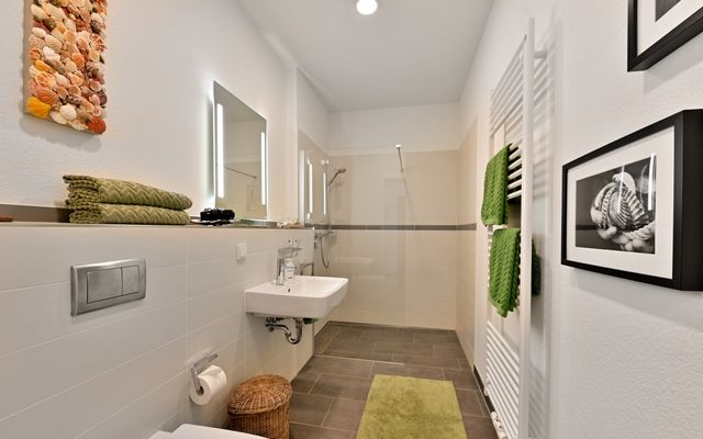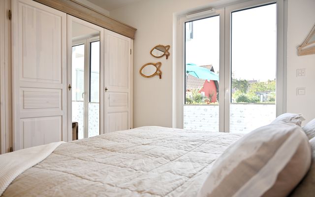 Die Ferienwohnung befindet sich im "Bodden-Markt" im Ortszentrum des Erholungsortes Glowe. Sie liegt auf der ruhigen Seite des Gebäudes. So können Sie Ihren Urlaub genießen und sind trotzdem mittendrin. Die Wohnung bietet auf ca. 50qm Wohnfläche einen gemütlichen Wohnraum mit Schlafcouch, integrierter Küche, einen Schlafraum mit Doppelbett und ein Bad mit Dusche. Für unsere kleinsten Gäste stehen Babybett, Hochstuhl und Spielzeug bereit. Auf der 15qm großen Terrasse mit West-Ausrichtung genießen Sie die frische Seeluft. Im Haus steht eine Sauna mit Relaxbereich zur Verfügung.