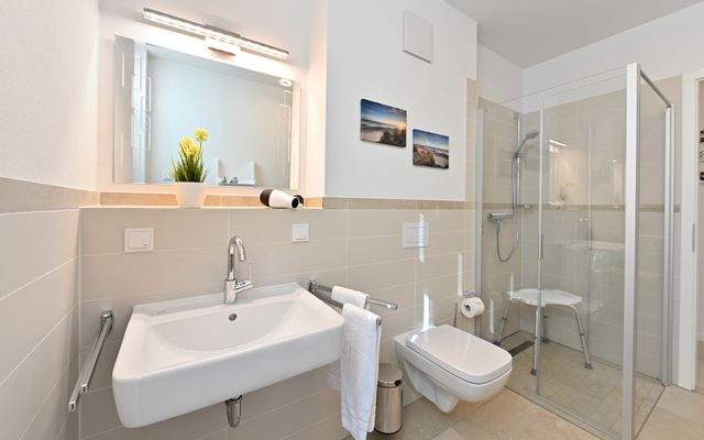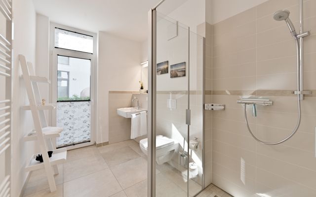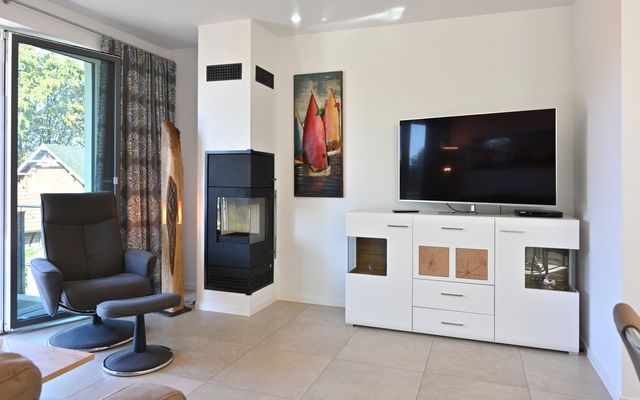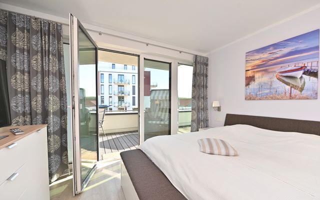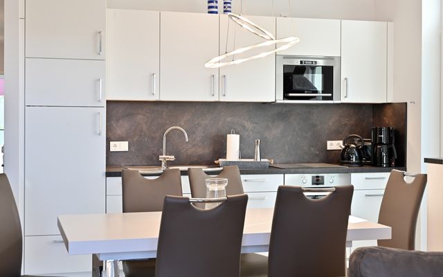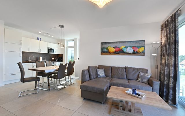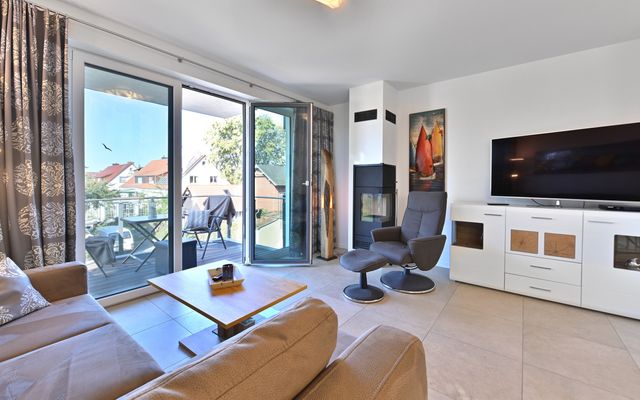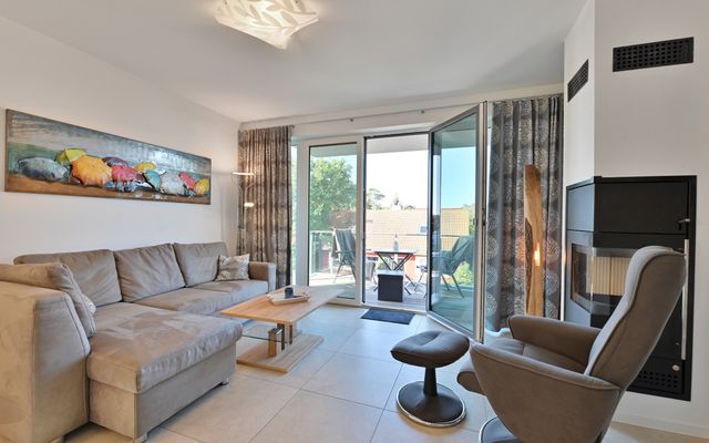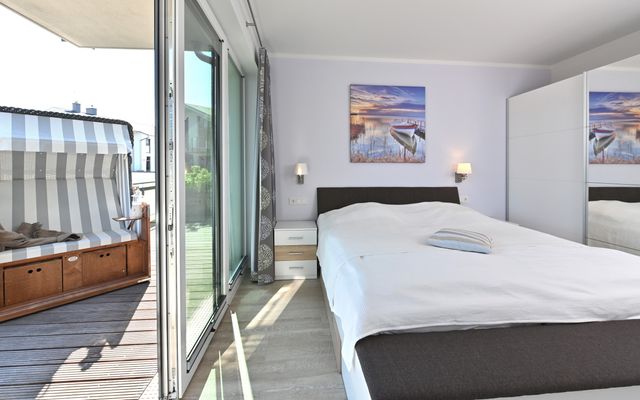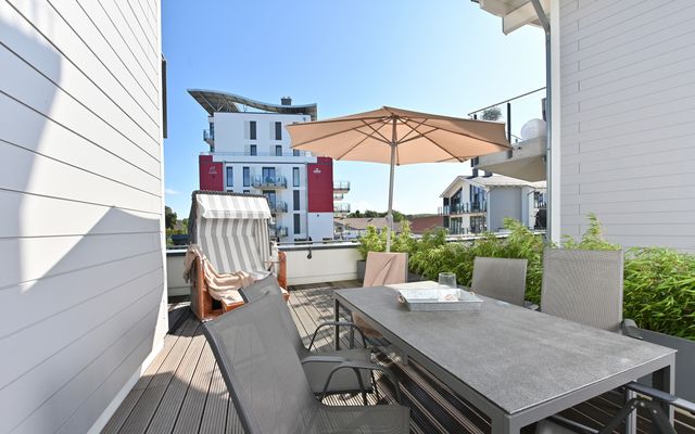 Das "Sonnendeck" bietet Platz für bis zu 6 Personen (4 Erwachsene und 2 Kinder). Die Wohnung bietet auf 96qm Wohnfläche einen gemütlichen Wohnraum mit integrierter Küche, zwei Schlafräume mit jeweils einem Doppelbett, ein Bad mit Dusche und ein Gäste-WC. Aus allen Räumen erreichen Sie entweder die Terrasse oder den Balkon. Im großzügigen Wohnbereich mit Couchlandschaft mit Schlaffunktion, TV-Gerät und Kamin für gemütliche Stunden ist der Essbereich und eine komfortable Küche integriert. Auf der großen Dachterrasse (61m²) mit Süd-West-Ausrichtung lassen Sie die Seele im Strandkorb baumeln.