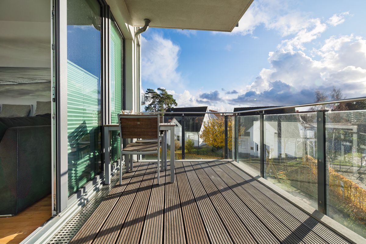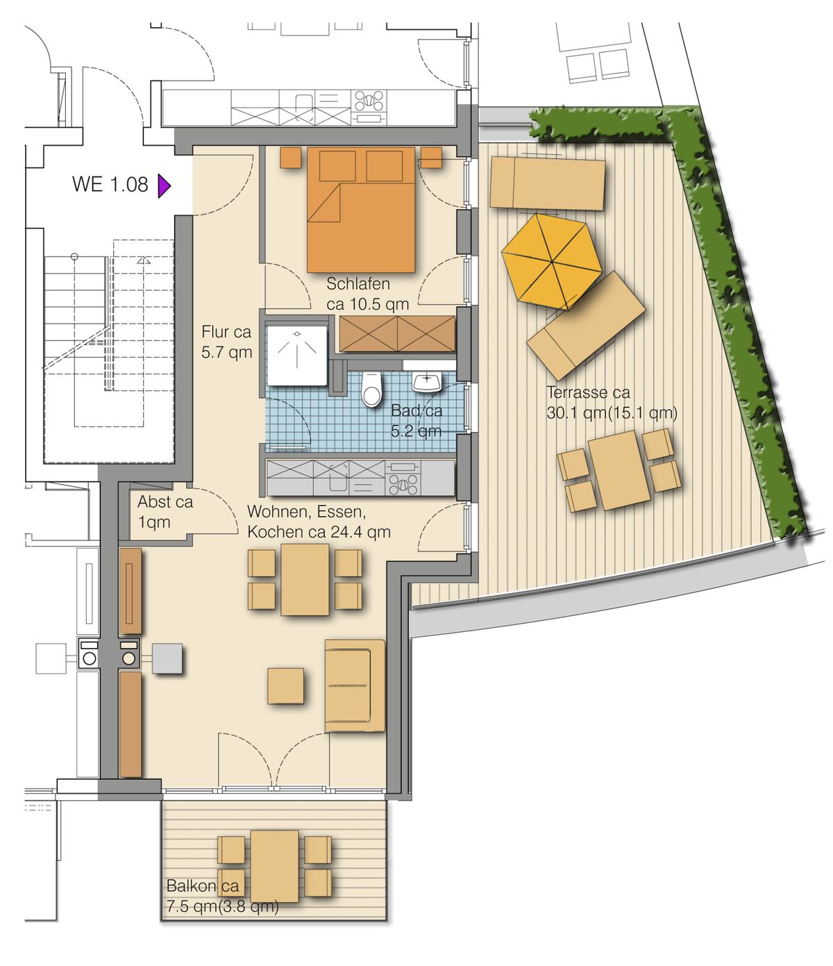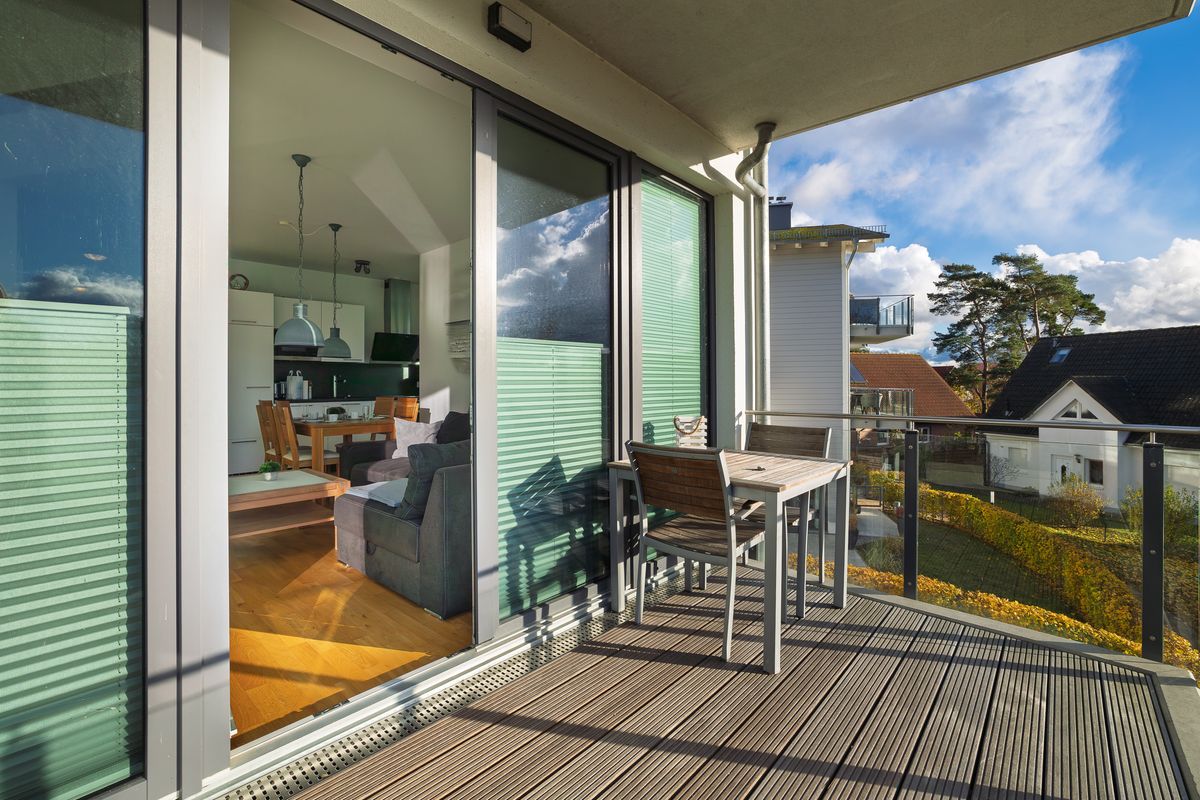- Balkon, Terrasse mit Gartenmöbeln, Sonnenschirm, Strandkorb