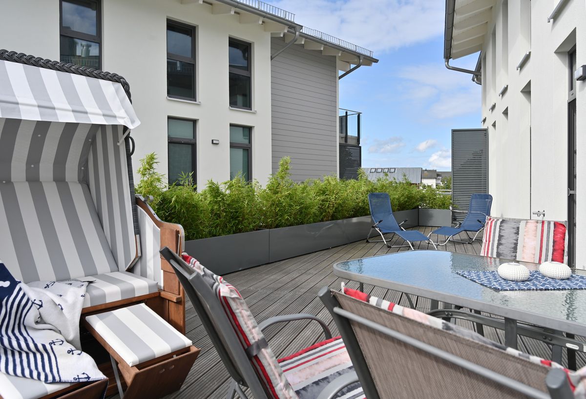 - Balkon mit Terrasse mit Möbeln, Sonnenliegen, Sonnenschirm