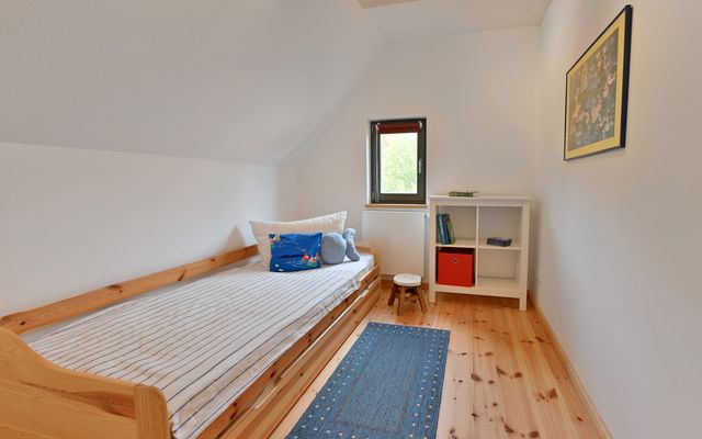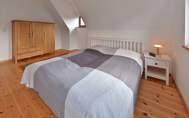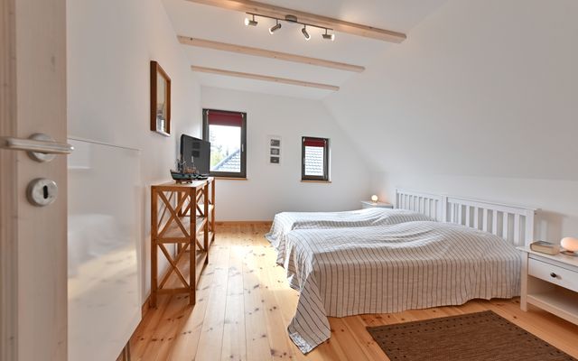 Das Ferienhaus verfügt im Obergeschoss über drei geräumige Schlafzimmer - ein Schlafzimmer mit Doppelbett, ein Schlafzimmer mit zwei Einzelbetten sowie ein Kinderschlafzimmer mit zwei vollwertigen Einzelbetten. Ein Babyreisebett kann zugestellt werden.