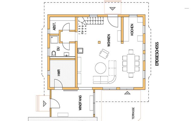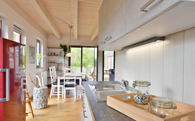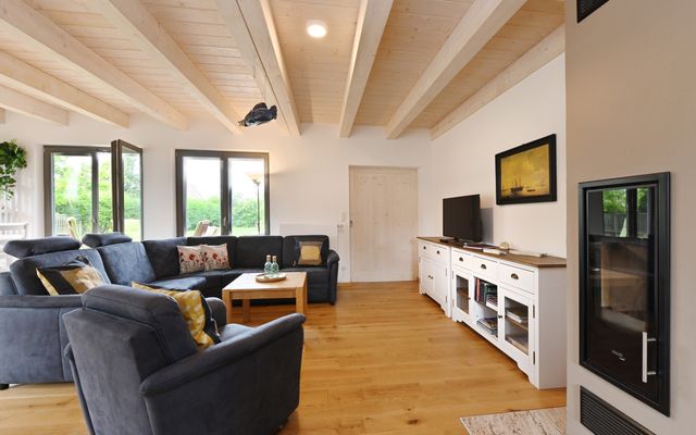 Der große Wohnbereich mit Holzmöbeln und Kamin sowie die Sonnenterrasse laden zum fröhlichen Beieinandersein ein! Das Haus ist großzügig mit angenehmem Raumklima durch Eichenholzdielen, Holzdecke und ökologische Zellulosedämmung.