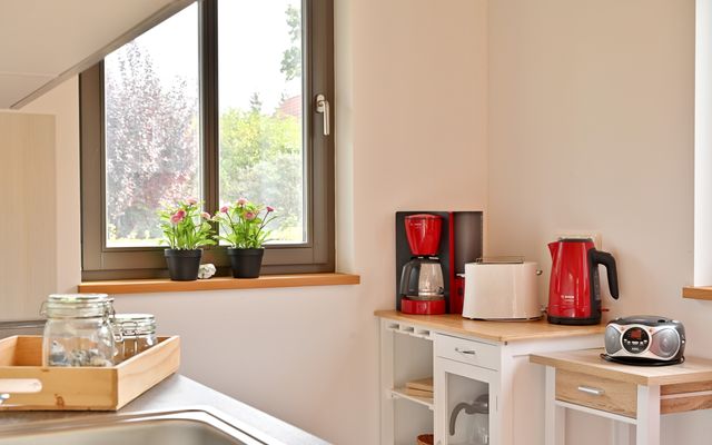 - Küche mit Kühlschrank mit Gefrierteil, Kaffeemaschine, Wasserkocher, Toaster u.v.m.