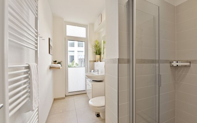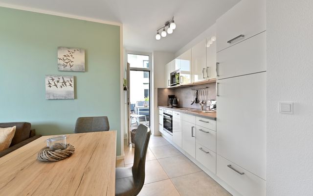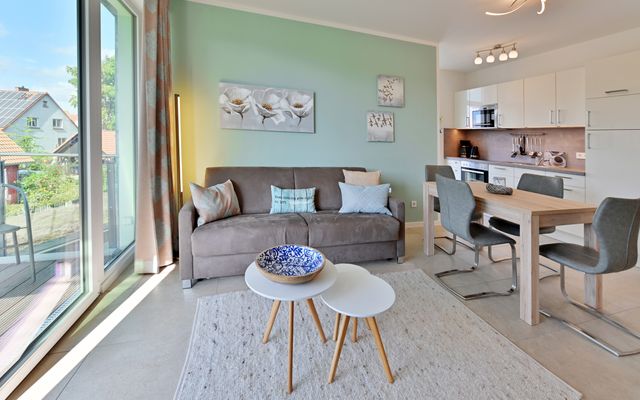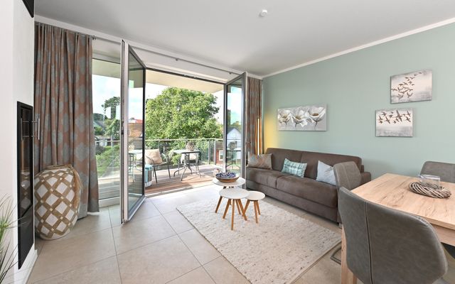 Die "Trauminsel" bietet auf 62qm Wohnfläche einen gemütlichen Wohnraum mit integrierter Küche, einen Schlafraum und ein Bad mit Dusche. Auf der 26qm großen Dachterrasse sowie einem zusätzlichen Balkon genießen Sie die frische Seeluft. Ein Strandkorb und Gartenmöbel laden hier zum Verweilen ein. Im Schlafzimmer finden Sie ein großes Doppelbett, das Bad besitzt eine ebenerdige Dusche.