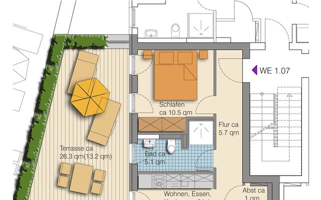 Das Feriendomizil ist sehr gemütlich und zum Wohlfühlen eingerichtet. Es liegt auf der ruhigen Seite des Gebäudes. So können Sie Ihren Urlaub genießen und sind trotzdem mittendrin.
