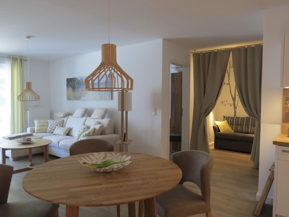 Das Feriendomizil besitzt einen großen Wohnbereich mit Couchecke und Flatscreen-TV, eine Küche mit allen Annehmlichkeiten und einen Esstisch, der Platz für 4 Personen bietet. Das Schlafzimmer verfügt über ein großes Doppelbett. Außerdem ist eine separate Schlafcouch (160cm x 200cm) vorhanden. Diese bietet Platz für zwei Kinder oder einen Erwachsenen. Das Bad ist großzügig und mit einer Echtglasdusche ausgestattet. Vor dem Haus steht Ihnen ein Parkplatz zur Verfügung. Auch stehen für die Gäste zwei Fahrräder kostenfrei, jedoch ohne Gewähr, zur Verfügung.