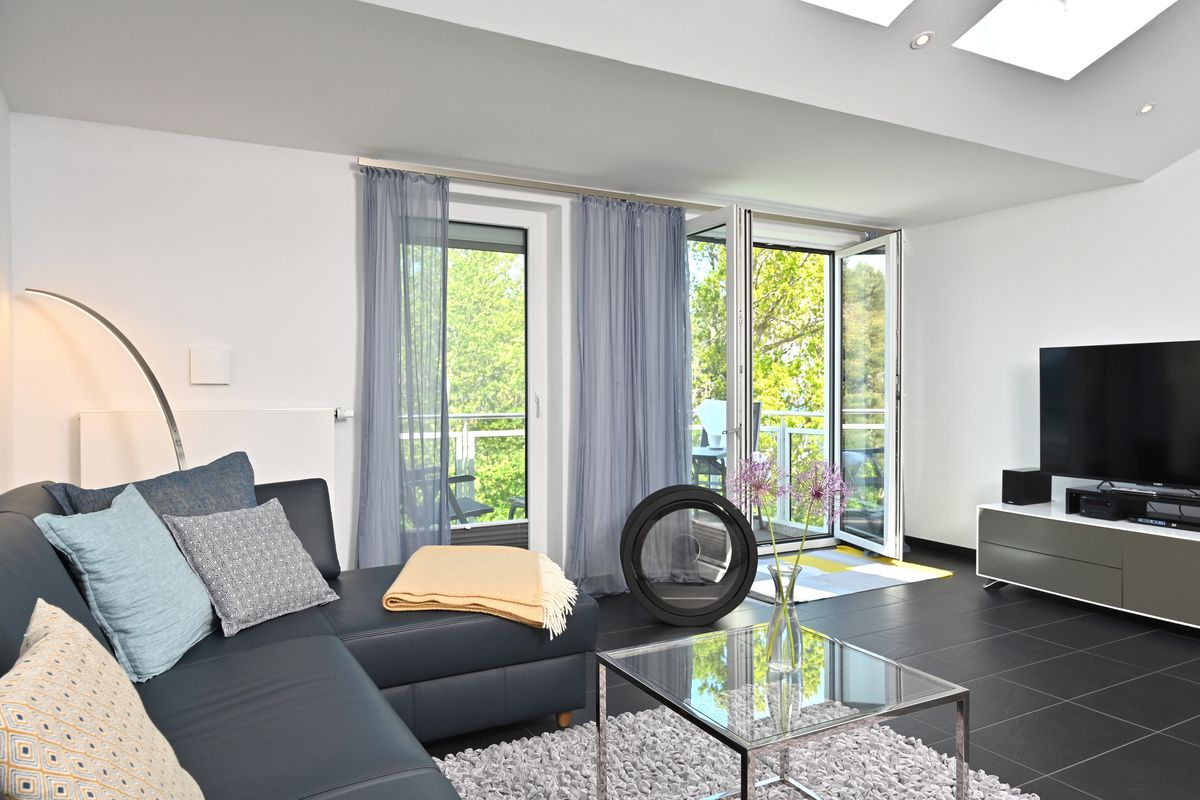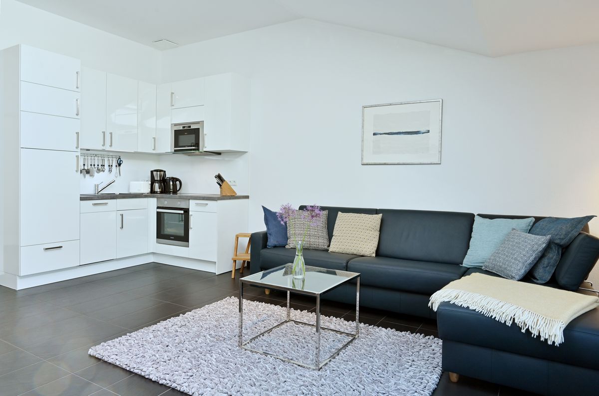 Auch aus der Unterkunft genießen Sie die Nähe zum Strand und den weiten Blick über das Meer. "KALA" verfügt über einen Nord-Balkon und eine Süd-Dachterrasse, ein Schlafzimmer mit Doppelbett und einen großzügigen Wohnbereich mit Ethanol-Kamin und integrierter Küche und Essbereich.