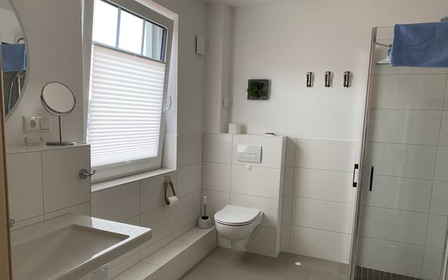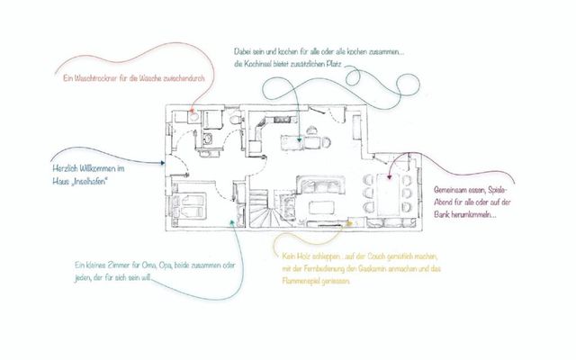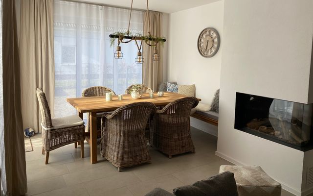 Im EG befindet sich ein kleines Schlafzimmer mit einem Doppelbett (140x200). Falls sich jemand zurückziehen möchte, findet er hier auch einen Fernseher. Gleich gegenüber befindet sich das Bad mit Dusche. Im großzügigem Wohn-Esszimmer mit offener Küche können Sie es sich gemütlich machen. Ob vor dem großen Fernseher mit Blu-Ray-Player, auf den gemütlichen Sofas oder am großen Tisch im Erker - hier genießen Sie einen entspannten Aufenthalt. In der kälteren Jahreszeit sorgt der Gaskamin (Nutzung 15,00€), ohne Holzschleppen, für eine angenehme Wärme und Gemütlichkeit.