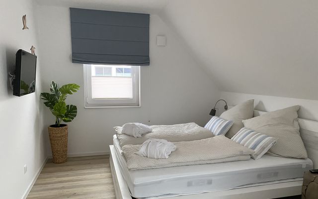 Im OG befinden sich zwei weitere Schlafzimmer, eins mit einem Doppelbett (180x200) und das andere mit zwei einzelnen Kojenbetten (90x200). In beiden Schlafzimmern finden Sie auch je einen Fernseher.