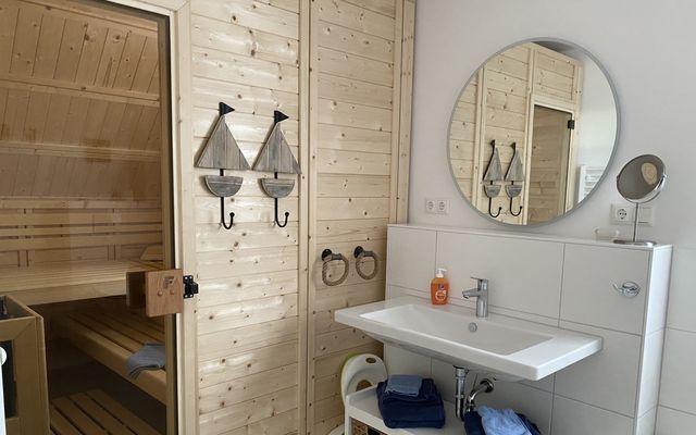 Saunatuch und ein Bademantel (wahlweise Gr.S/M oder L/XL) können gegen eine Gebühr von 10,- € geliehen werden. Ein Waschtrockner sorgt für frische Wäsche.