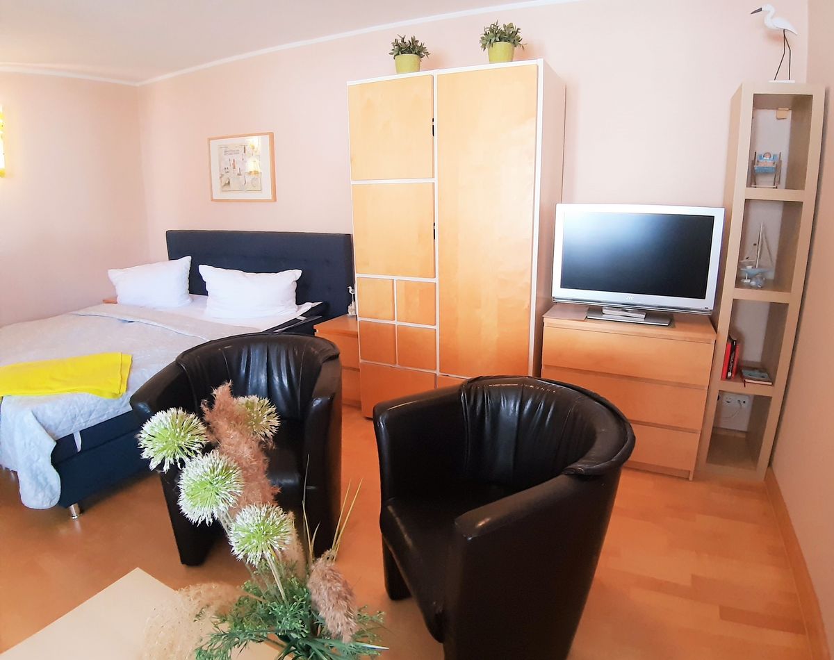 Der Wohnbereich verfügt über eine Küchenzeile, eine Sitzecke mit Couch und TV sowie etwas abgetrennt, ein bequemes Boxspringbett (180 cmx 200cm) . Der Balkon ist aus dem Wohnbereich begehbar.