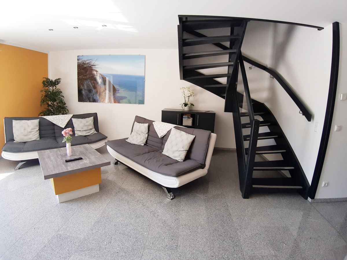 Im Erdgeschoss befinden sich neben einem offenem Wohn- und Essbereich mit TV auch ein großzügiges Gäste-Bad, ein separates Fernsehzimmer mit Couch und die Terrasse.
