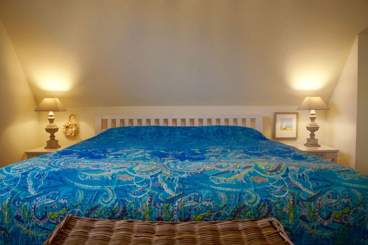 Im Obergeschoss befinden sich zwei Schlafzimmer, wovon das eine in hellen, harmonisch abgestimmten Sand- und Türkistönen gehalten ist. Das Zimmer ist mit einem 180 x 200 cm Doppelbett, Doppelkommode und einem Kleiderschrank ausgestattet. Auf Wunsch kann ein Kinderbettchen dazugestellt werden.