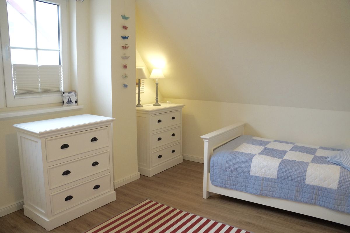 Das zweite Schlafzimmer, maritim in Rot und Blau gestaltet, verfügt über zwei Einzelbetten 90 x 200 cm, 2 Kommoden und einen Kleiderschrank.