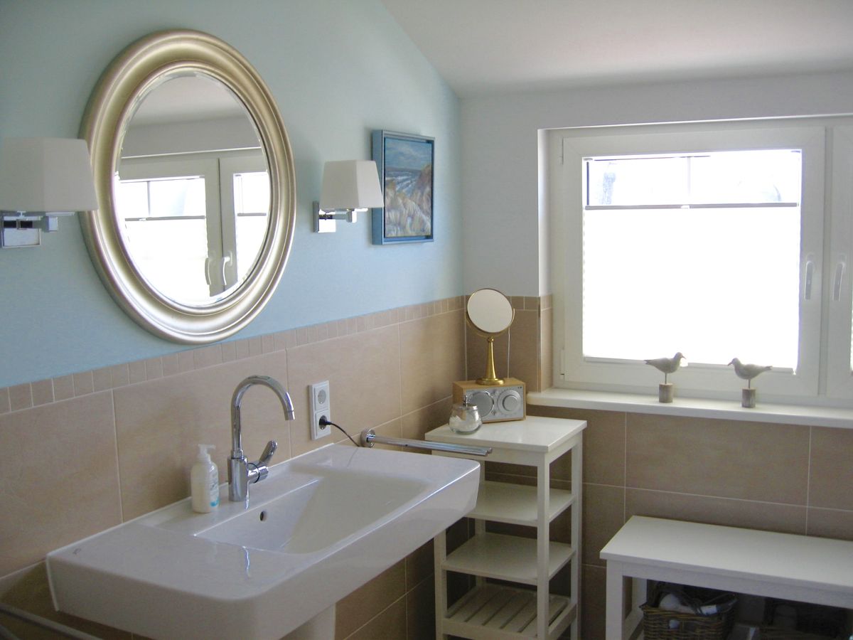 Beide Schlafzimmer haben wärmeabsorbierende Plissees und lassen sich komplett verdunkeln. Insektenschutzgitter sind vorhanden. Von dem im Obergeschoss gelegenen großzügigen Bad mit Dusche und WC blickt man direkt auf den Bodden.