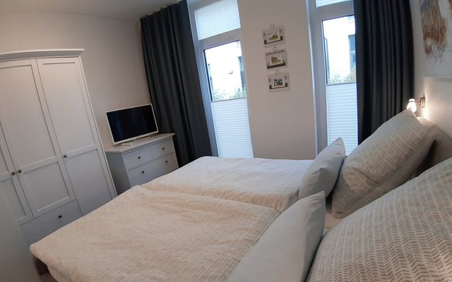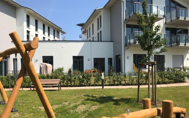 Die Wohnung "Riecht nach Meer" besitzt 2 Schlafzimmer, ein Bad mit Dusche, ein Gäste-WC und einen Wohnbereich mit Essbereich, Kamin und integrierter Küche, außerdem einen Balkon und eine riesige Dachterrasse mit Strandkorb. Zur Wohnung gehört ein Tiefgaragenstellplatz. Im Gebäude steht Ihnen eine Gemeinschaftssauna (kostenfrei) sowie ein Waschsalon (kostenpflichtig) mit Waschmaschine und Trockner zur Verfügung. Ihre Drahtesel parken Sie im abschließbaren Fahrradraum. Unsere Minis vergnügen sich auf einem kleinen Spielplatz.
