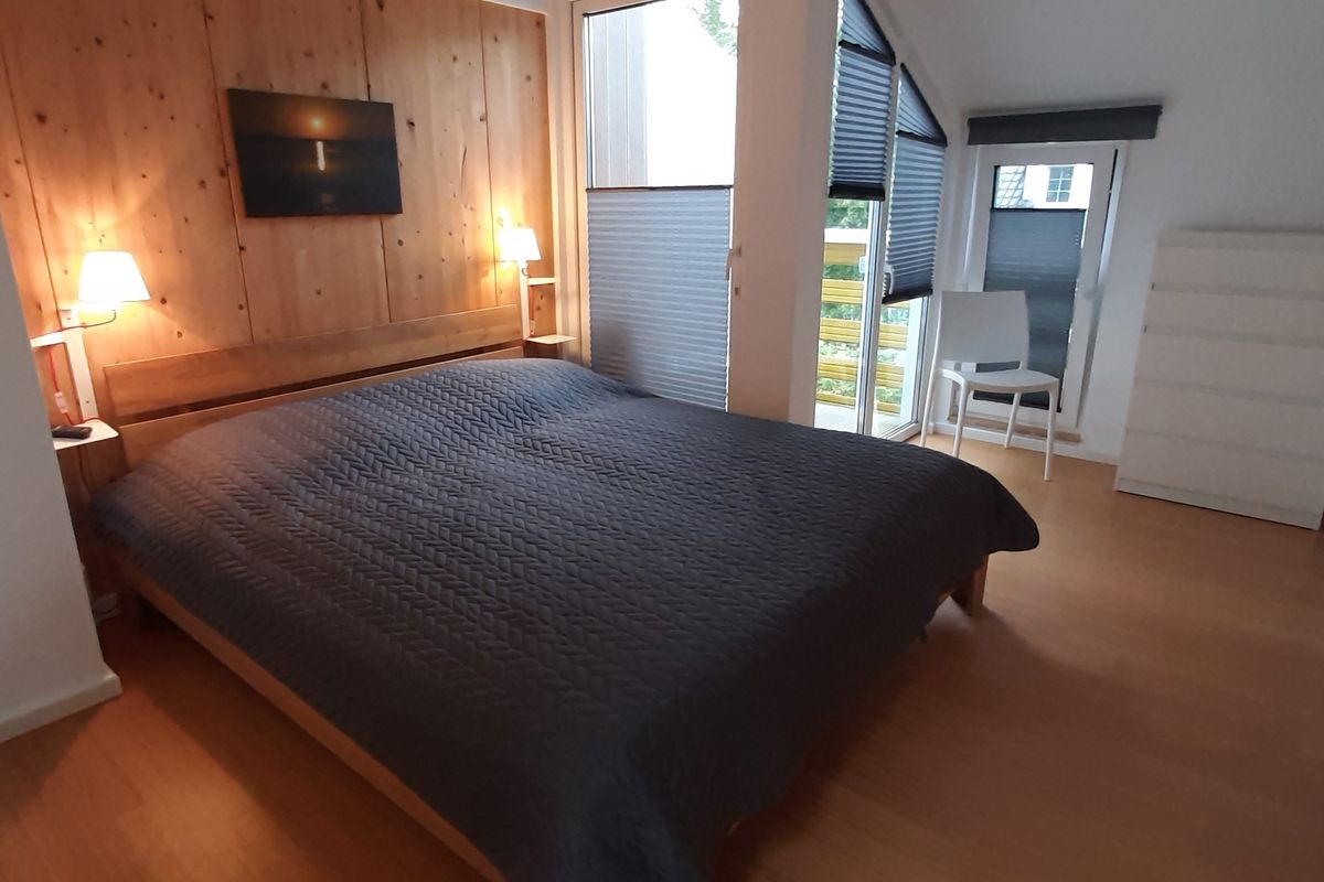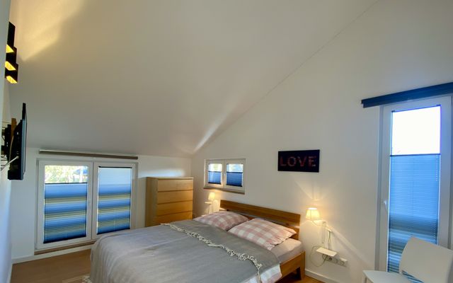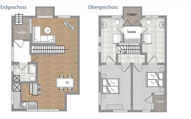 Das behagliche, offene Wohnzimmer mit bodentiefen Fenstern und direktem Zugang zum Garten, ein großer Smart-TV mit Blu-ray-Player, eine Bluetooth-Stereoanlage und der Essbereich mit Kaminofen und offener Küche sind Kommunikationsmittelpunkte des Hauses. Die Ausstattung der Küche bietet: eine Spülmaschine, Kaffeemaschine, Nespressomaschine, Milchaufschäumer, Mikrowelle, Wasserkocher, Toaster sowie umfangreiche Küchenutensilien. Im EG ist ein zusätzliches Bad mit Dusche, Waschmaschine und Trockner vorhanden. Zwei Schlafzimmer mit Doppelbett im Obergeschoss, jeweils mit Flachbild-TV und jeweils eigenem En-Suite-Bad und eine kleine Sauna, die von beiden Badezimmern aus zu betreten ist, bilden zusammen mit der Loggia ein weiteres Highlight.