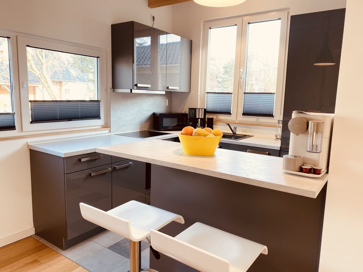 - Küche mit Spülmaschine, Backofen, Mikrowelle, Kühlschrank mit Gefrierfach, Kaffeemaschine, Toaster, Wasserkocher