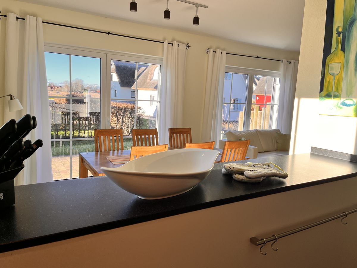 Die reetgedeckte Doppelhaushälfte "Wellenläufer" liegt in ruhiger Lage zwischen Breeger Bodden (80m) und der Ostsee (400m).