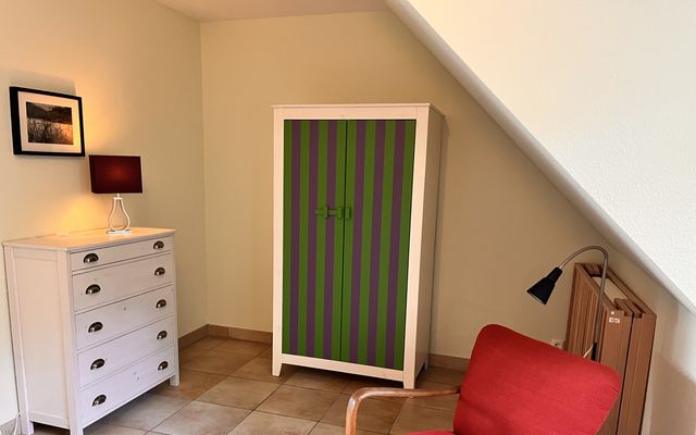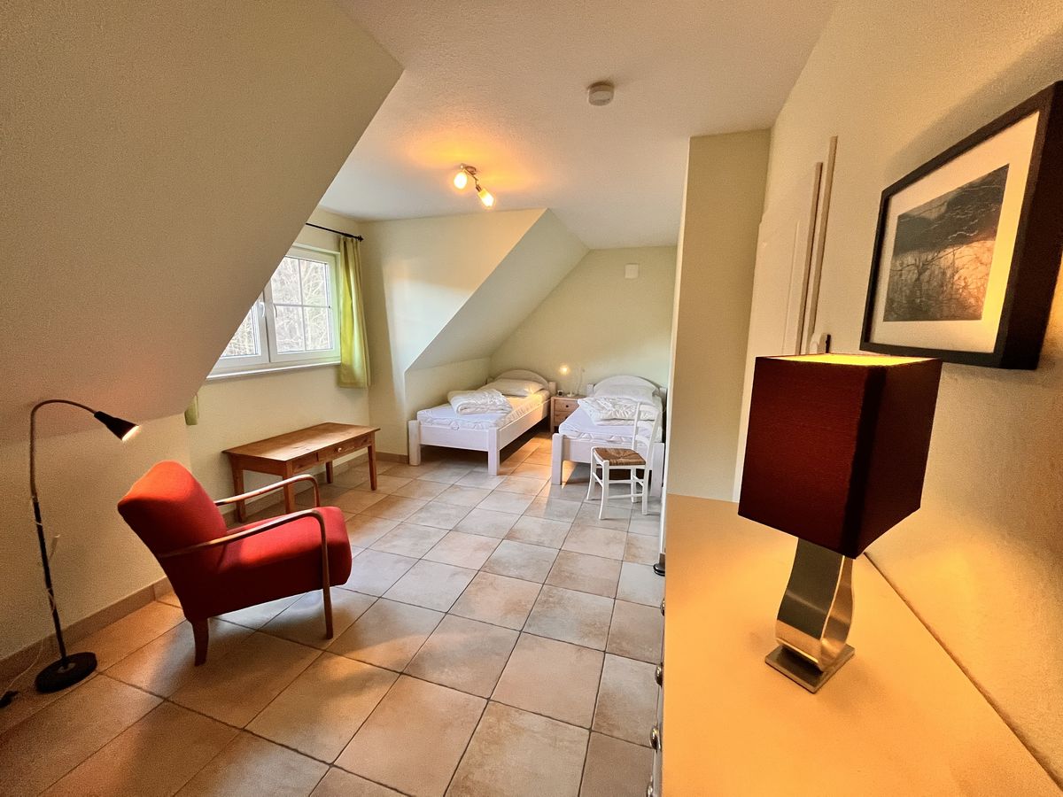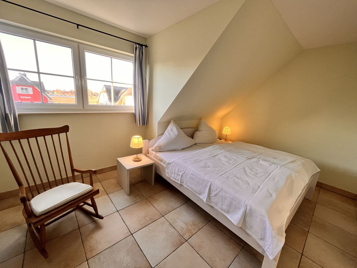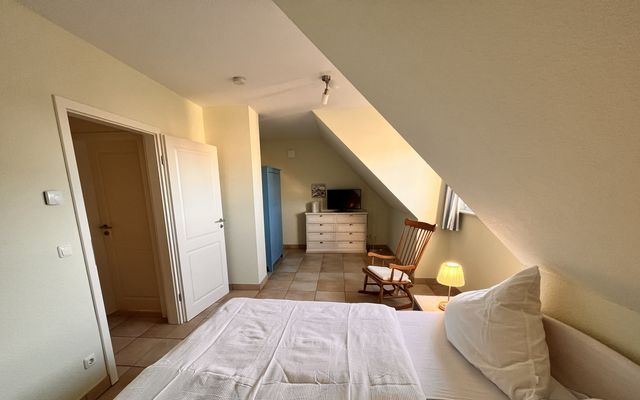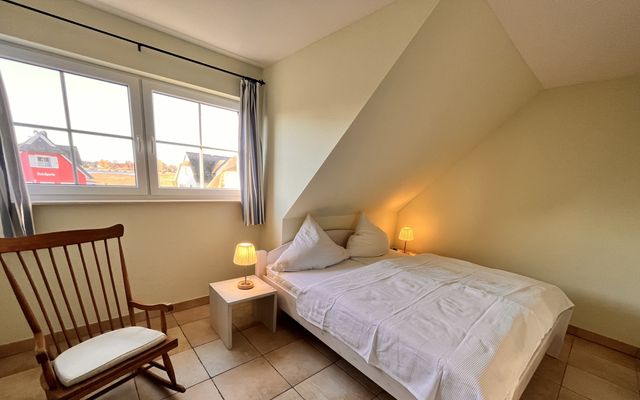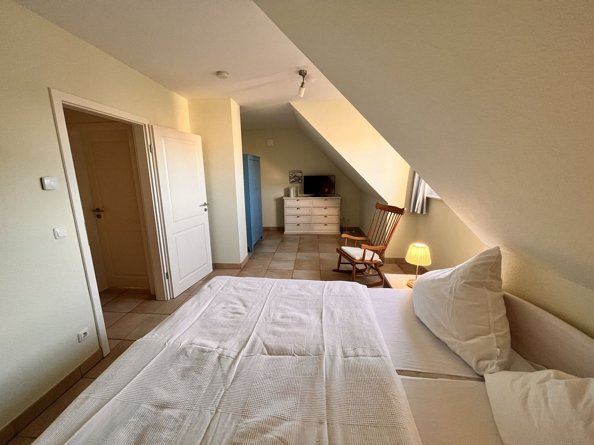 In der oberen Etage des ca. 110 m² großen Reetdachhauses mit Fußbodenheizung befinden sich zwei Schlafzimmer (1x Doppelbett und 1x 2 Einzelbetten + 1 Babybett) und ein Badezimmer mit Dusche und Badewanne. Im Erdgeschoss ist ein drittes Schlafzimmer mit Etagenbett zu finden. Der Wohn- und Essbereich mit Kamin und integrierter Küche ist gemütlich und lichtdurchflutet. Außerdem beherbergt das Erdgeschoss ein weiteres Bad mit Dusche und Waschmaschine. Die große Süd-West ausgerichtete Terrasse mit Strandkorb (500m² Grundstück) lädt zum Relaxen ein.
