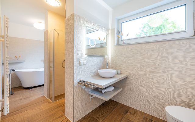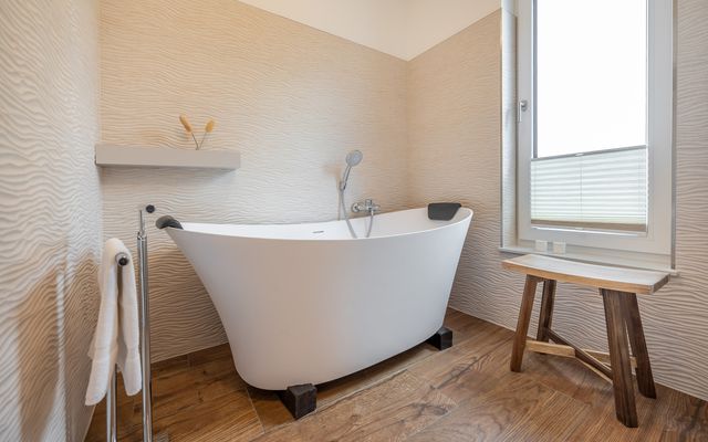 Innere Ruhe finden Sie im Wellness-Bad mit ebenerdiger Dusche und elegant freistehender Badewanne, ideal für ein romantisches Badevergnügen zu zweit. Entspannung pur, ohne die Wohnung verlassen zu müssen.