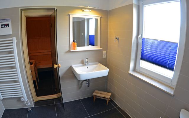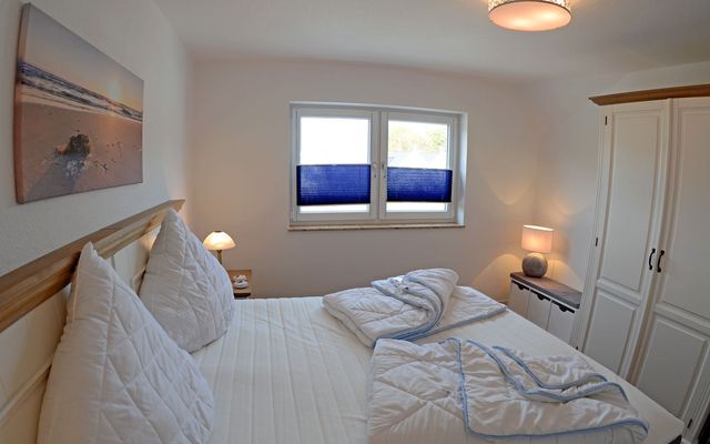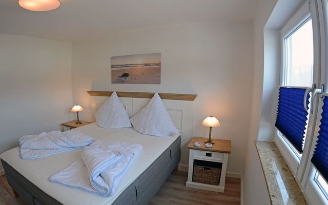 Im Obergeschoss finden sich zwei Schlafzimmer mit je einem Boxspringbett (1 Matratze 180×200), großem Kleiderschrank und TV. Für Ihren Mini ist ein feststehendes Kinderbett vorhanden. Ein Balkon mit Aussicht auf den Bodden vervollständigt Ihre Urlaubsidylle. An das Bad mit Dusche im OG schließt eine Sauna für max. 3-4 Personen an. Ein Mückennetz in allen Räumen verschont Sie von lästigen Insekten.