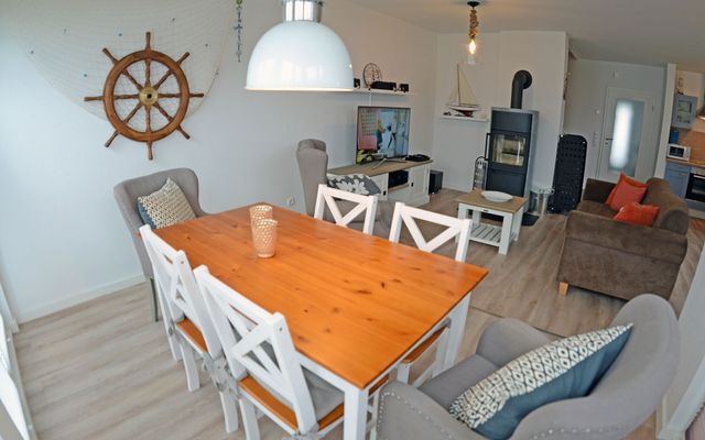 Das Ferienhaus "Bootsmann" ist im Erdgeschoss ausgestattet mit einem großzügigen Wohn- und Essbereich mit gemütlicher Couchlandschaft, Kamin und TV, Sat mit Dolby Surround Anlage, DVD & CD Player, Gesellschaftsspielen und Büchern, mit einer offenen, komplett ausgestatteten Einbauküche mit 4- Plattenherd (Ceranfeld), Backofen, Kühl- und Gefrierkombination, Geschirrspüler und diversen Elektrogeräten z.B. Mikrowelle, Kaffeemaschine. Hier steht auch ein Bad mit Dusche zur Verfügung. Das Schlafzimmer im EG ist mit einem Etagenbett (Matratze je 90×200), Kinderspielzeug und großem Kleiderschrank eingerichtet. Im Abstellraum steht eine Waschmaschine zur Verfügung.