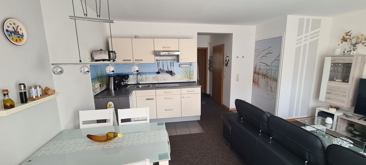 - Küche mit Cerankochfeld, Mikrowelle mit Umluft Backofen und Grill, Wasserkocher, Toaster, Kaffeepadmaschine und Filterkaffeemaschine