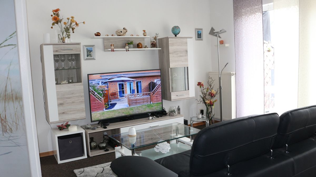- Wohnbereich mit Leder Eckcouch und großem 55Zoll Curved TV
