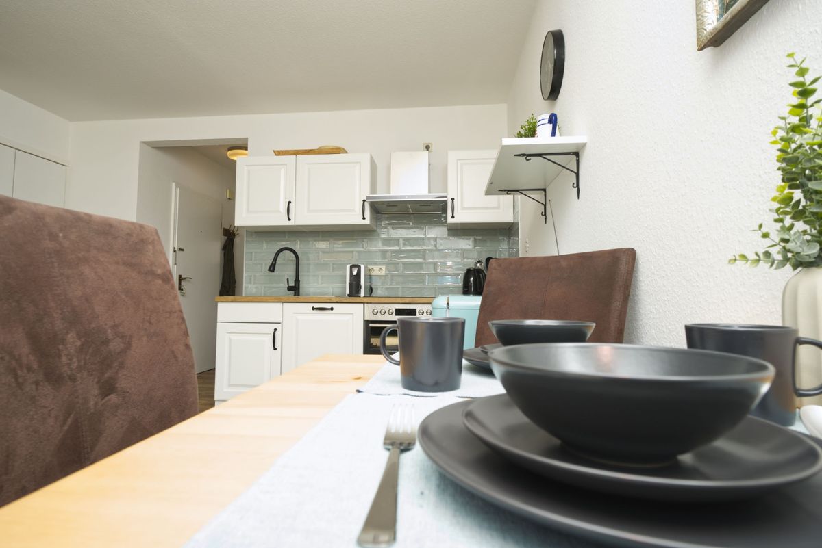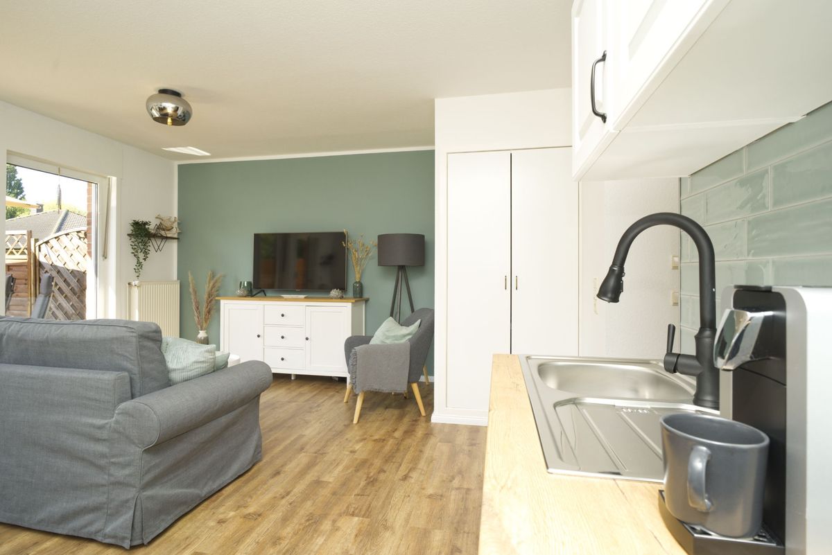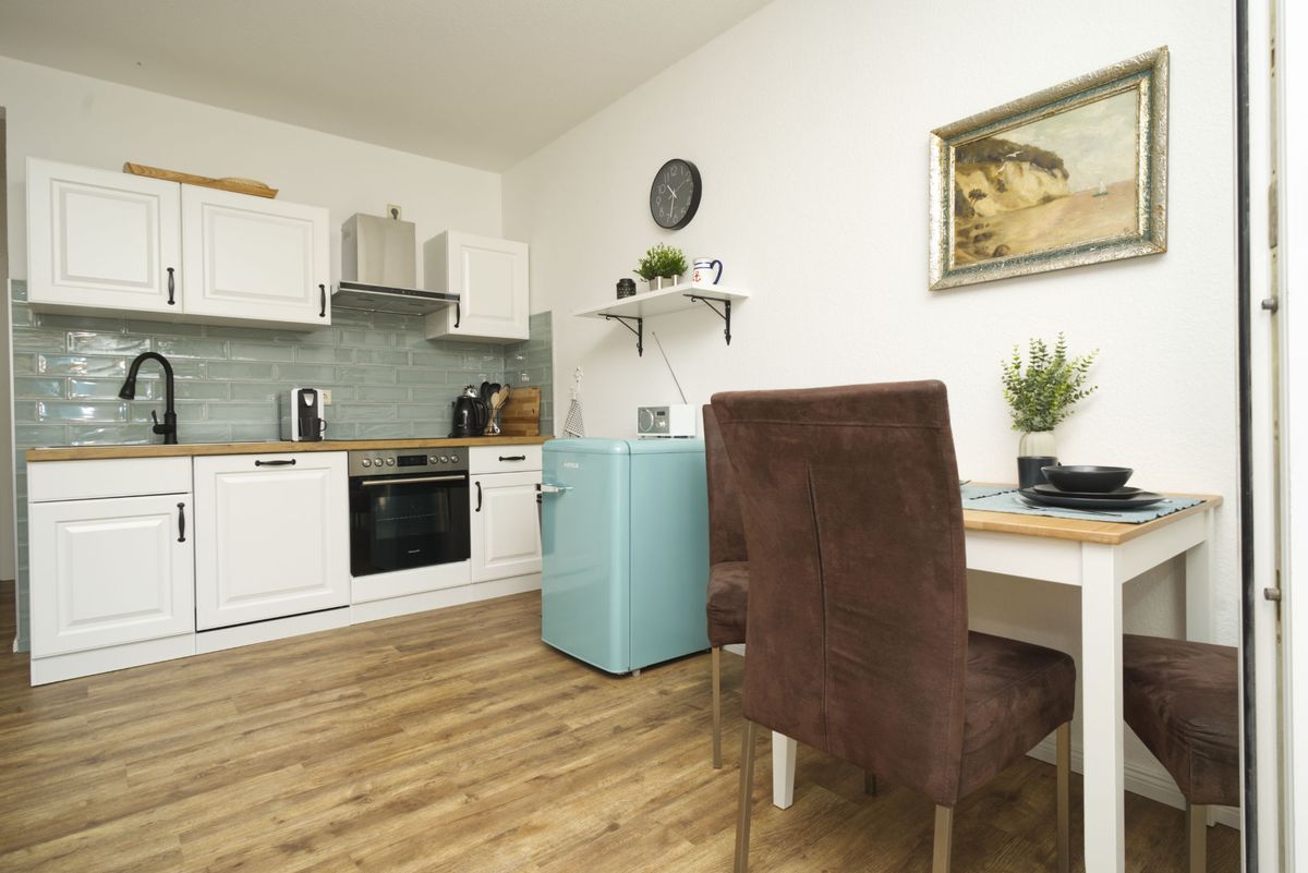 - Küche mit Spülmaschine, Herd mit Backofen, Filter- und Kapselkaffeemaschine